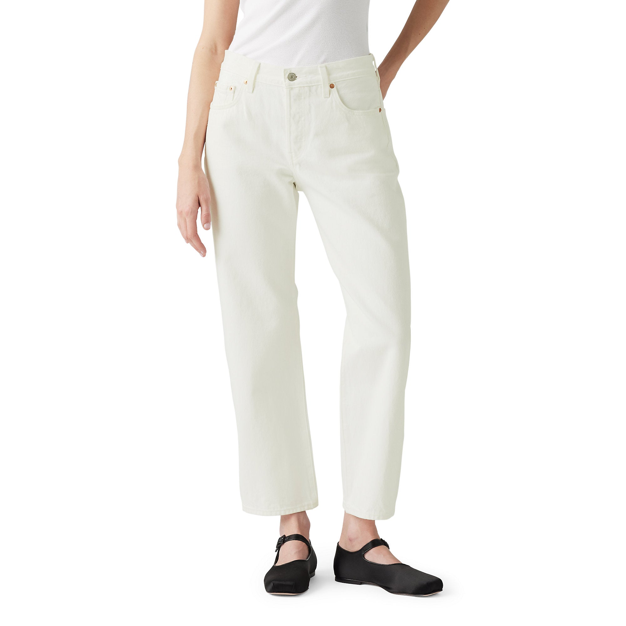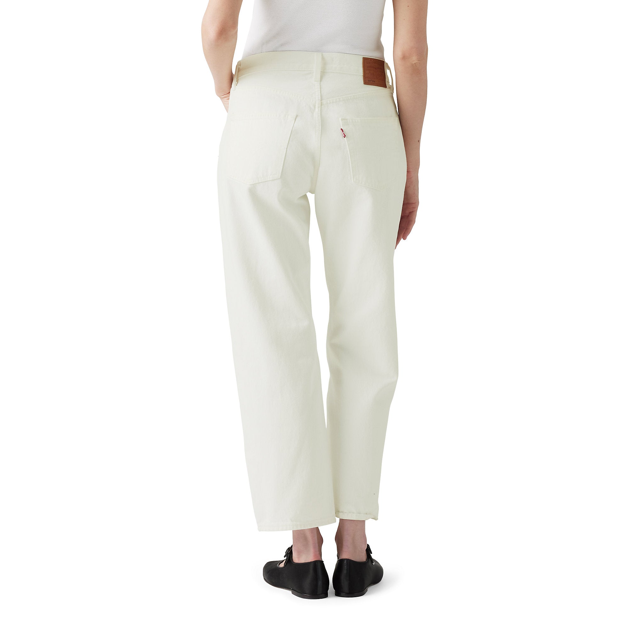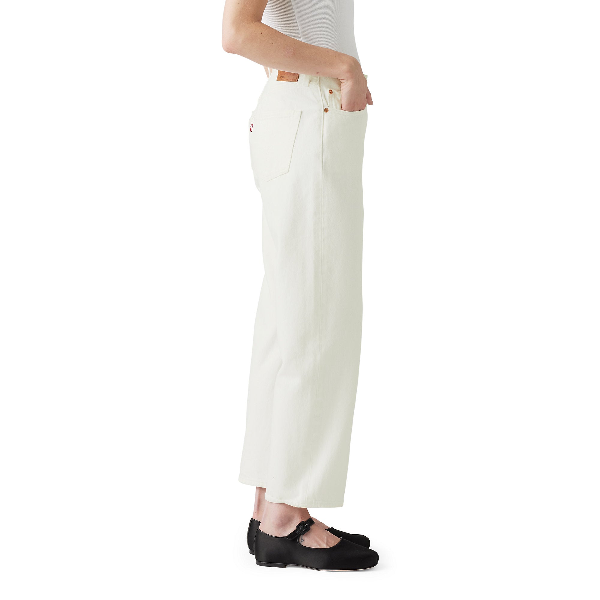 Mid-rise with a loose straight fit and ankle length. Button fly. Non-stretch white denim.