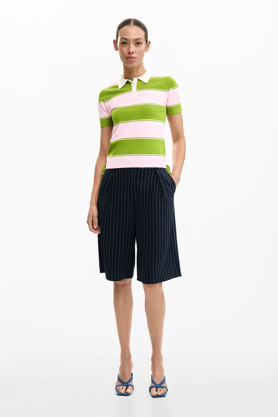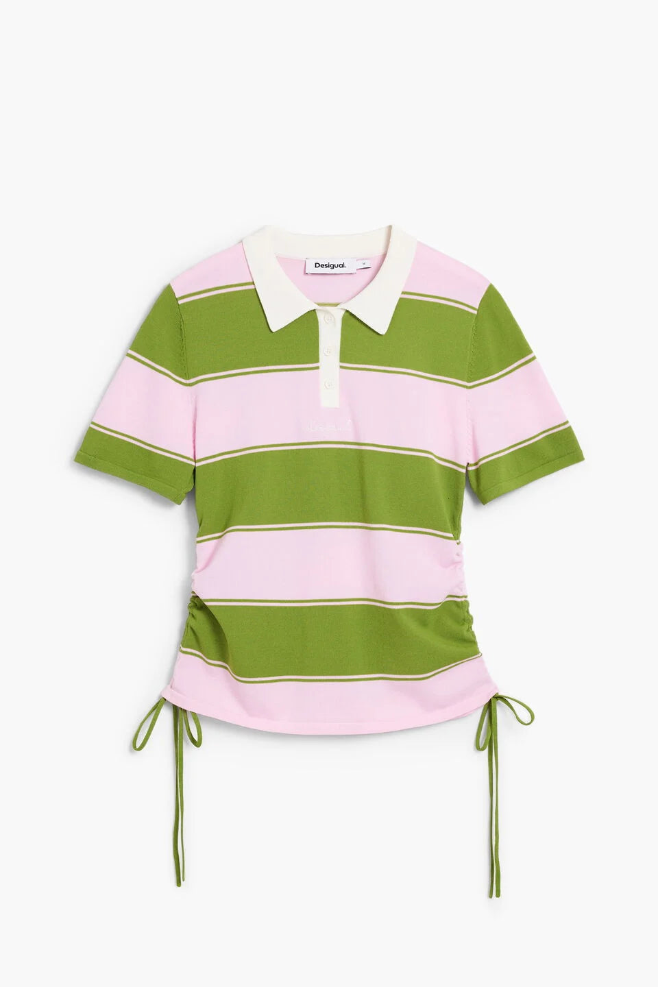 A modern polo-inspired top that blends sporty structure with a playful. contemporary edge. Designed with a crisp shirt-style collar and buttoned neckline. it features a streamlined silhouette enhanced by adjustable side drawstrings that subtly shape the fit. The horizontal stripe pattern adds a bold. graphic dimension. while the short sleeves and soft knit feel keep it effortlessly wearable. Finished with a delicate embroidered logo. it’s a versatile piece that balances casual ease with a polished. fashion-forward attitude.