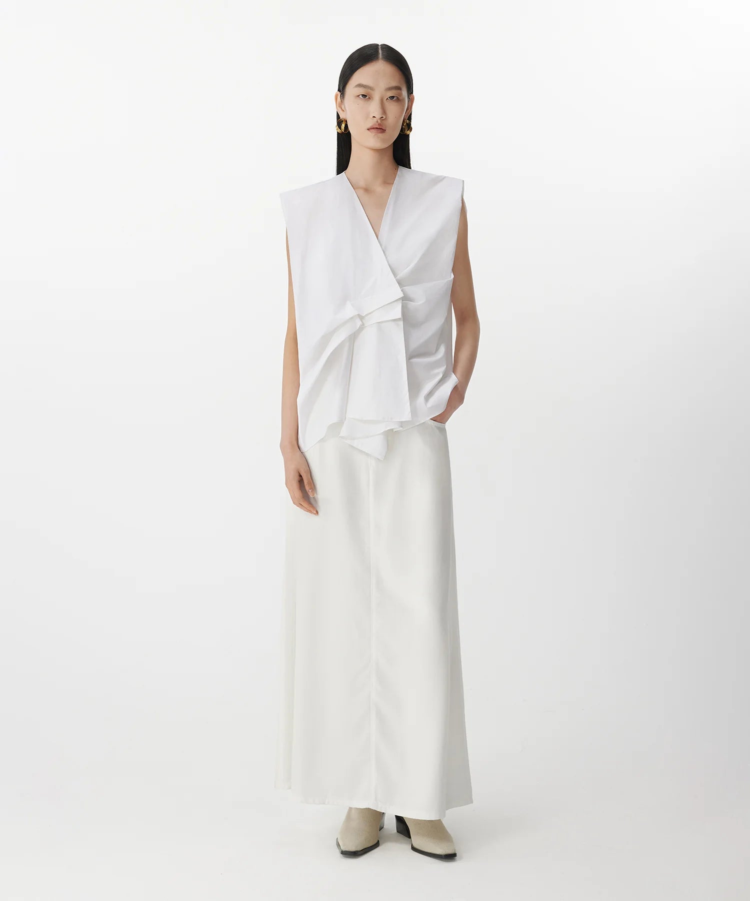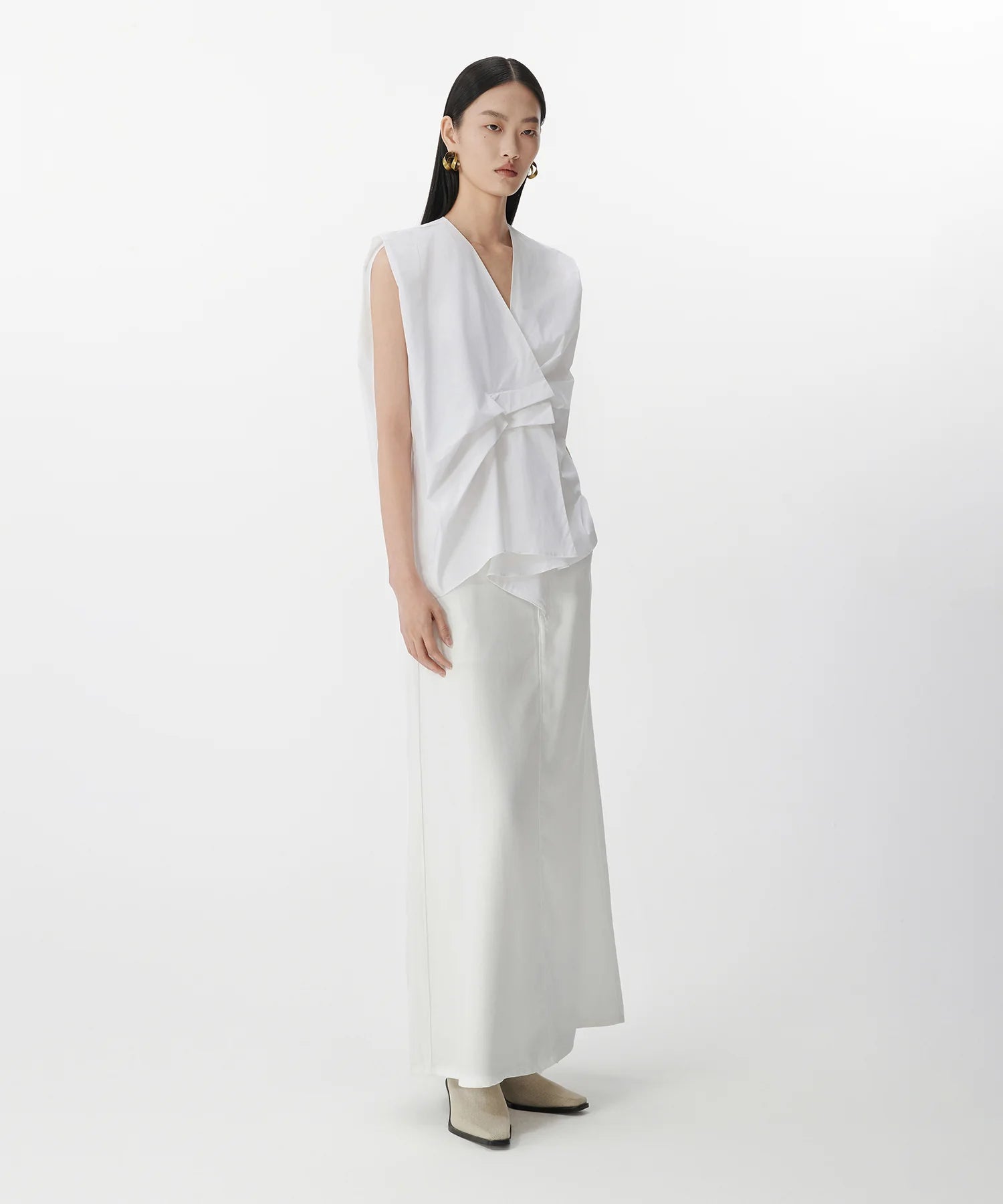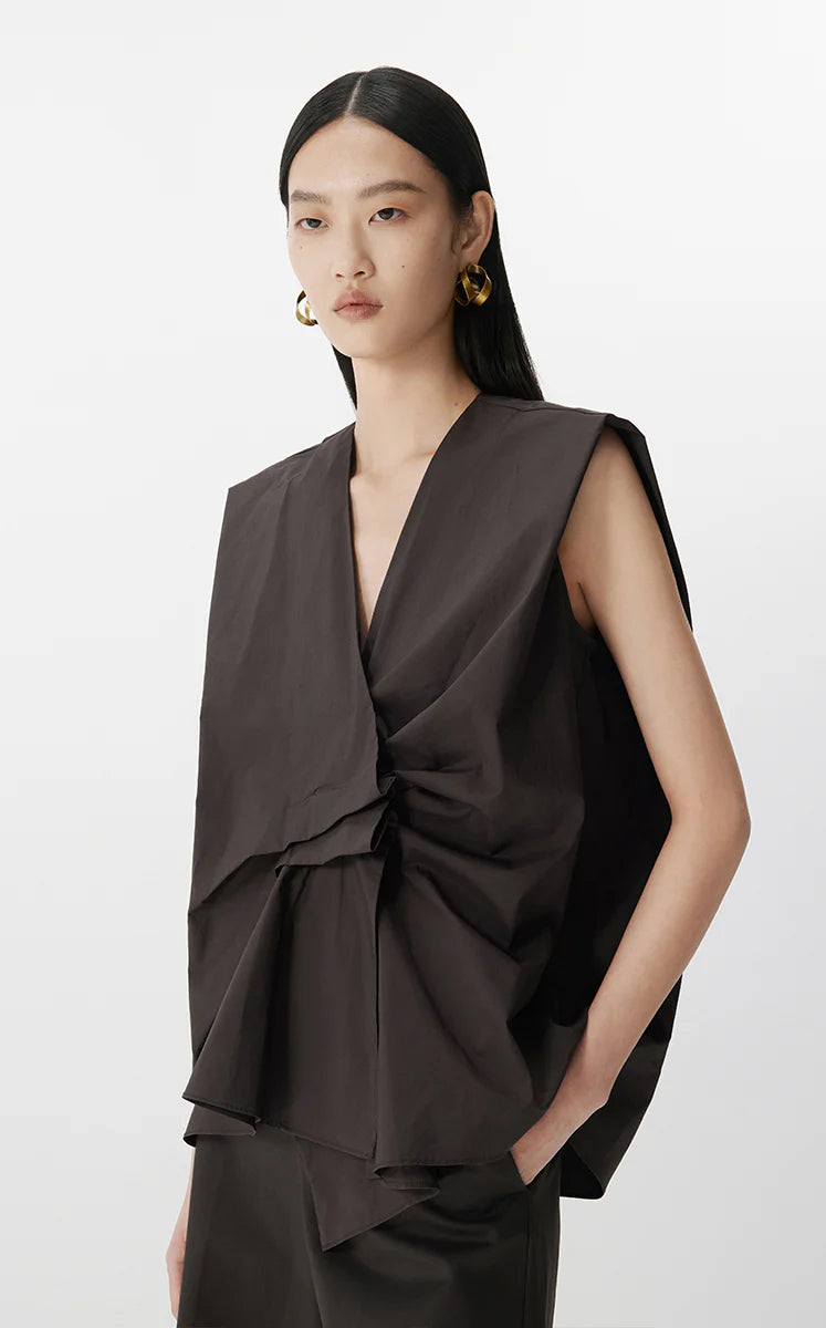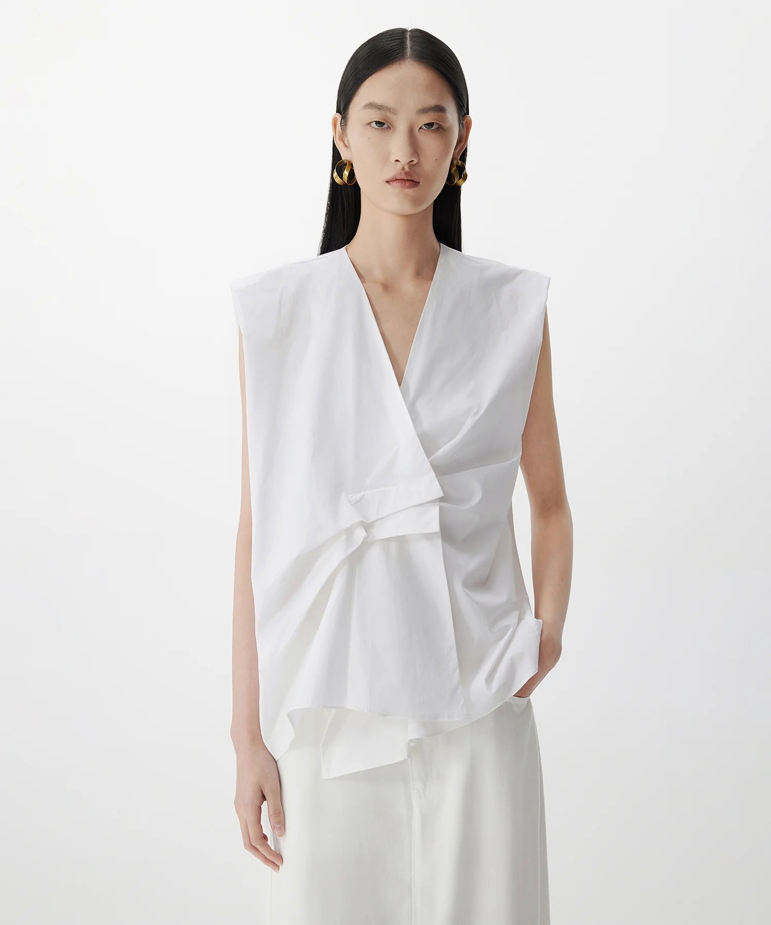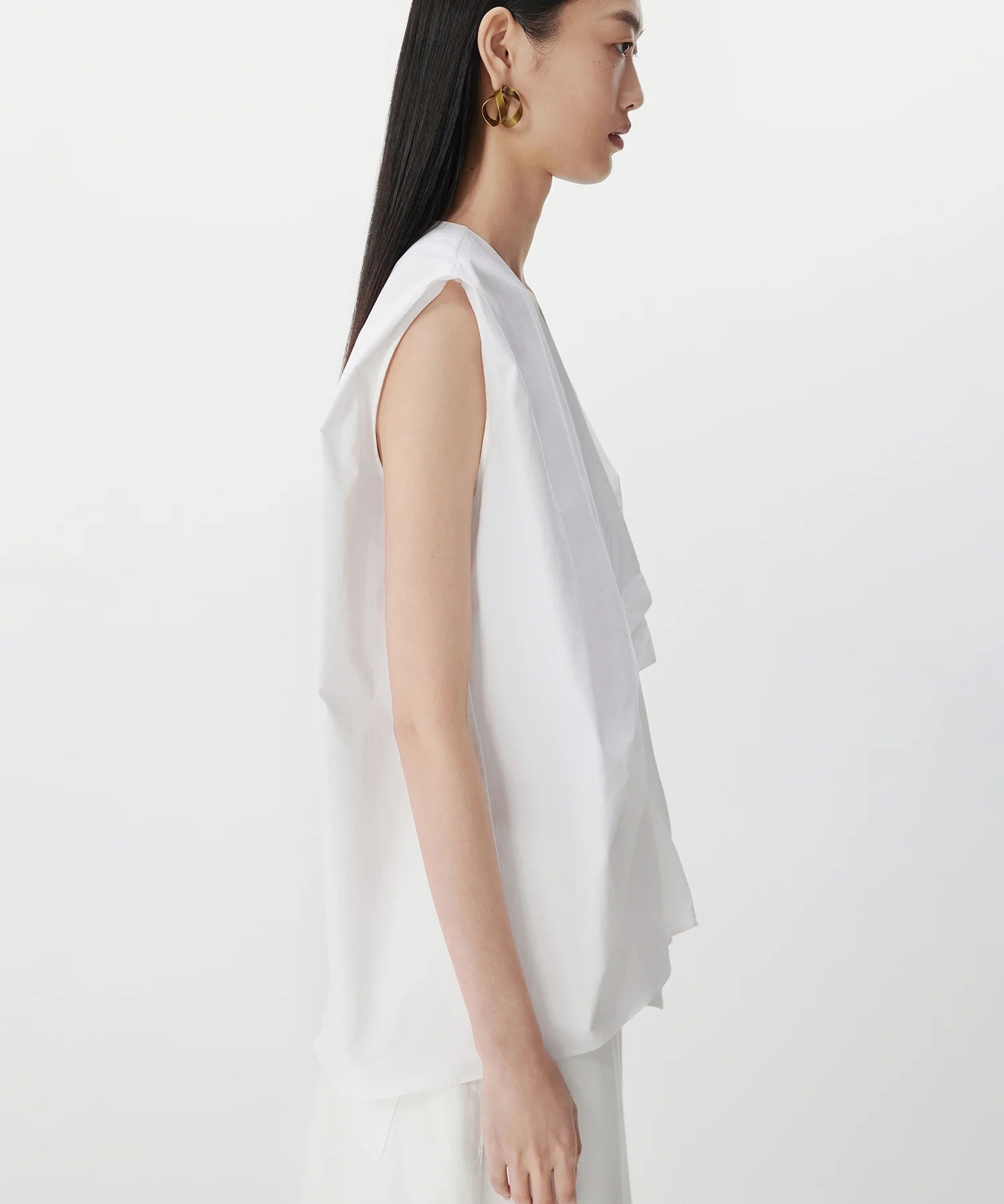 Asymmetrical Tuck Sleeveless Blouse. This sophisticated sleeveless blouse features eye-catching asymmetrical tucks on the front. The three-dimensional details enhance its feminine softness and a touch of modern style. The lightweight. breathable material provides a cool. comfortable fit perfect for the coming season. This versatile piece looks great on its own or worn under a jacket.