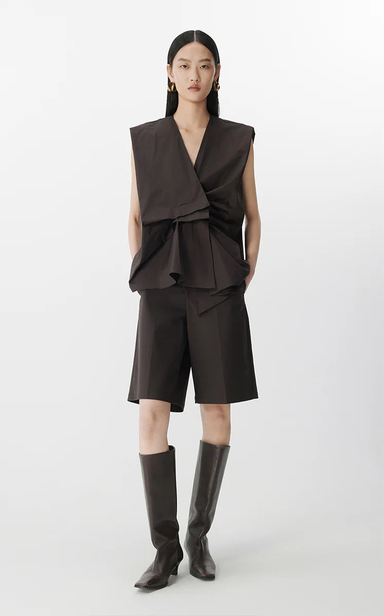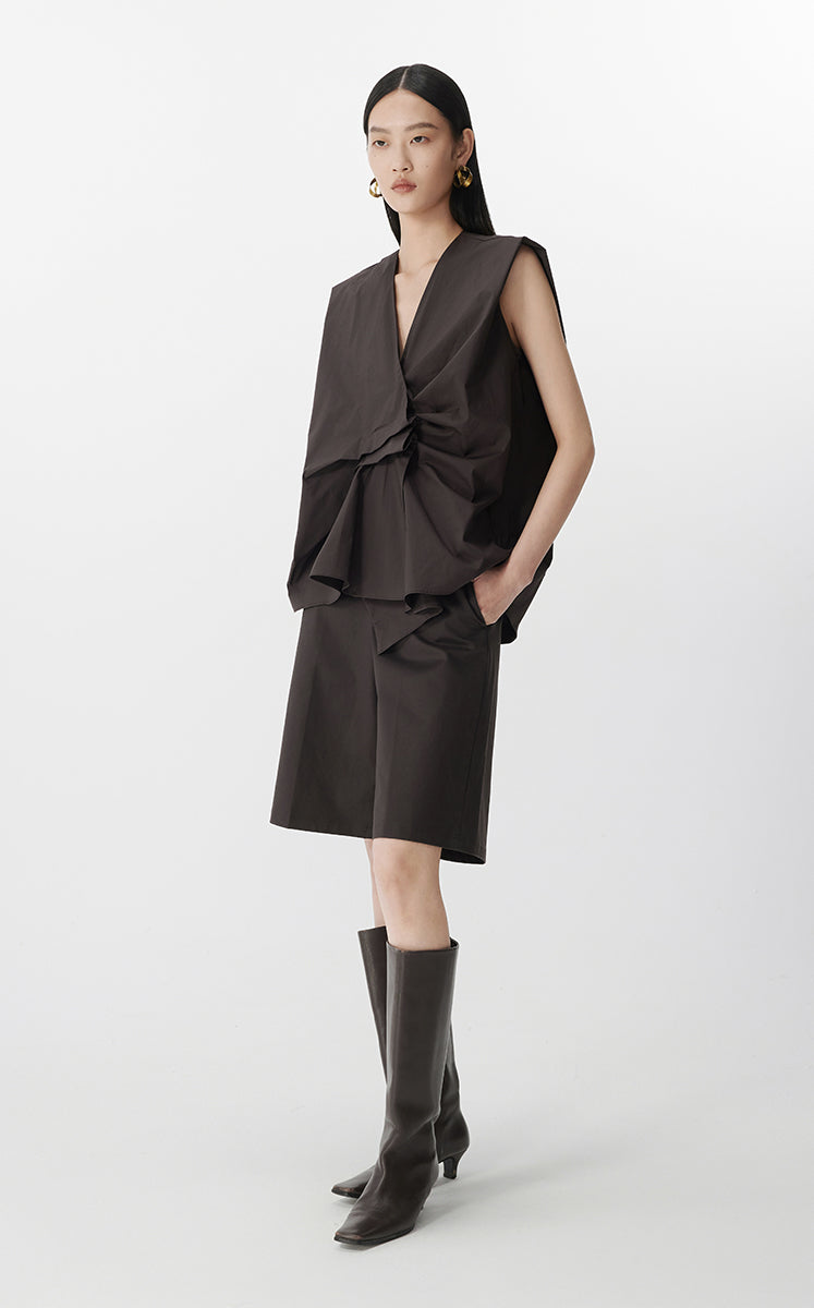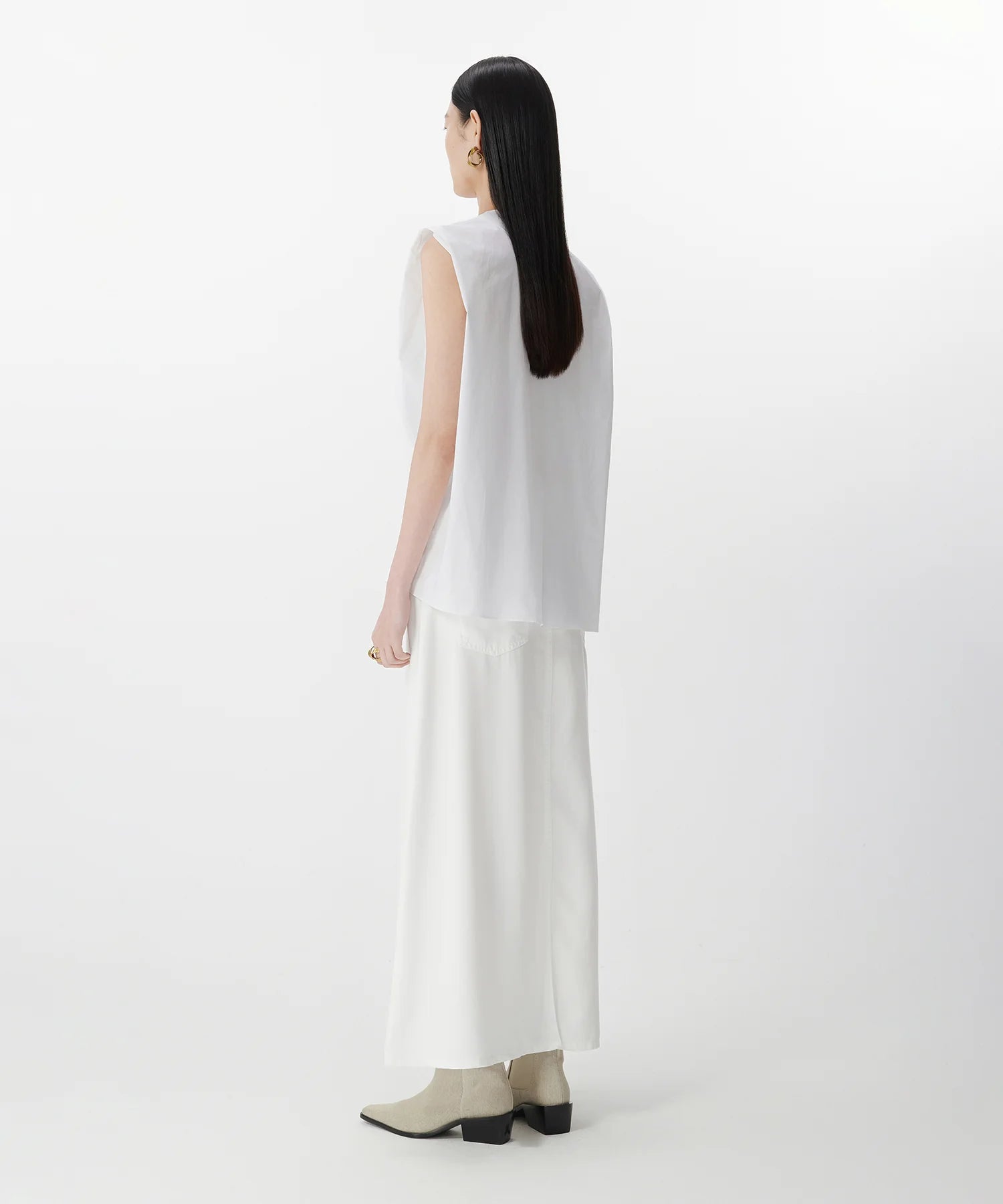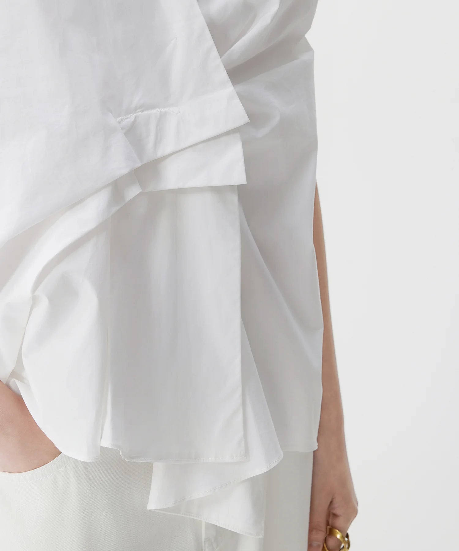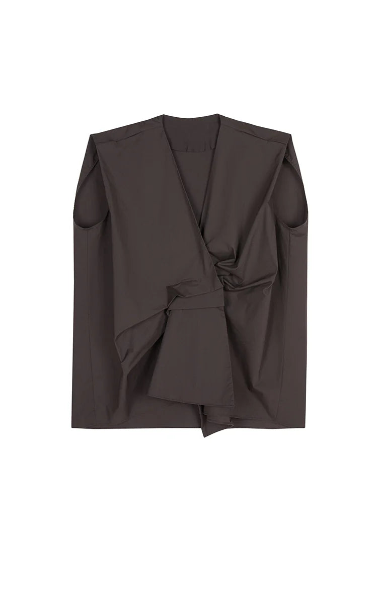 Asymmetrical Tuck Sleeveless Blouse. This sophisticated sleeveless blouse features eye-catching asymmetrical tucks on the front. The three-dimensional details enhance its feminine softness and a touch of modern style. The lightweight. breathable material provides a cool. comfortable fit perfect for the coming season. This versatile piece looks great on its own or worn under a jacket.