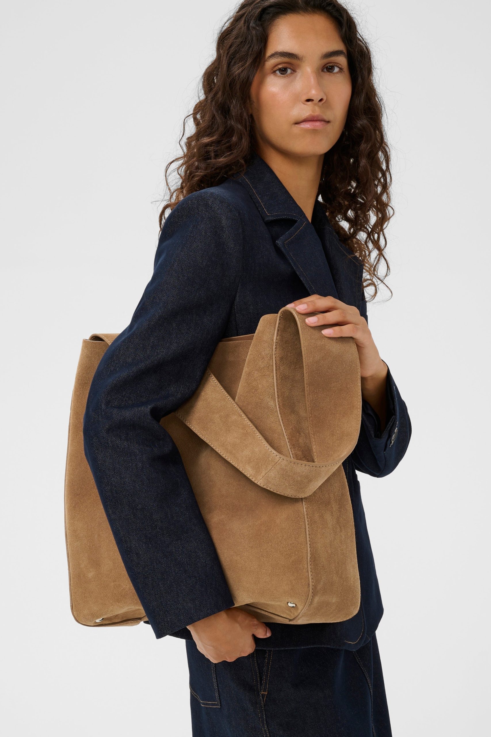 This oversized tote bag offers a relaxed aesthetic with its slouchy. unstructured silhouette. It features a wide shoulder strap integrated into the main body for comfortable. effortless carrying. Perfectly sized for daily essentials. it is a versatile choice for the office. shopping. or travel. Pair it with a structured coat for contrast or casual separates for a refined. modern look.