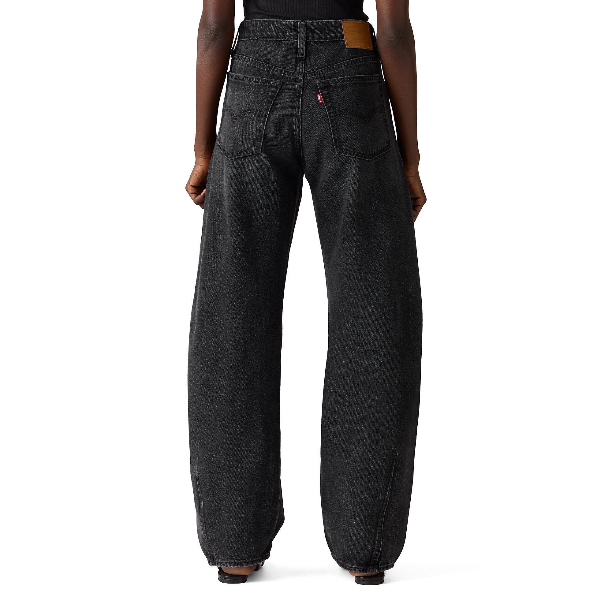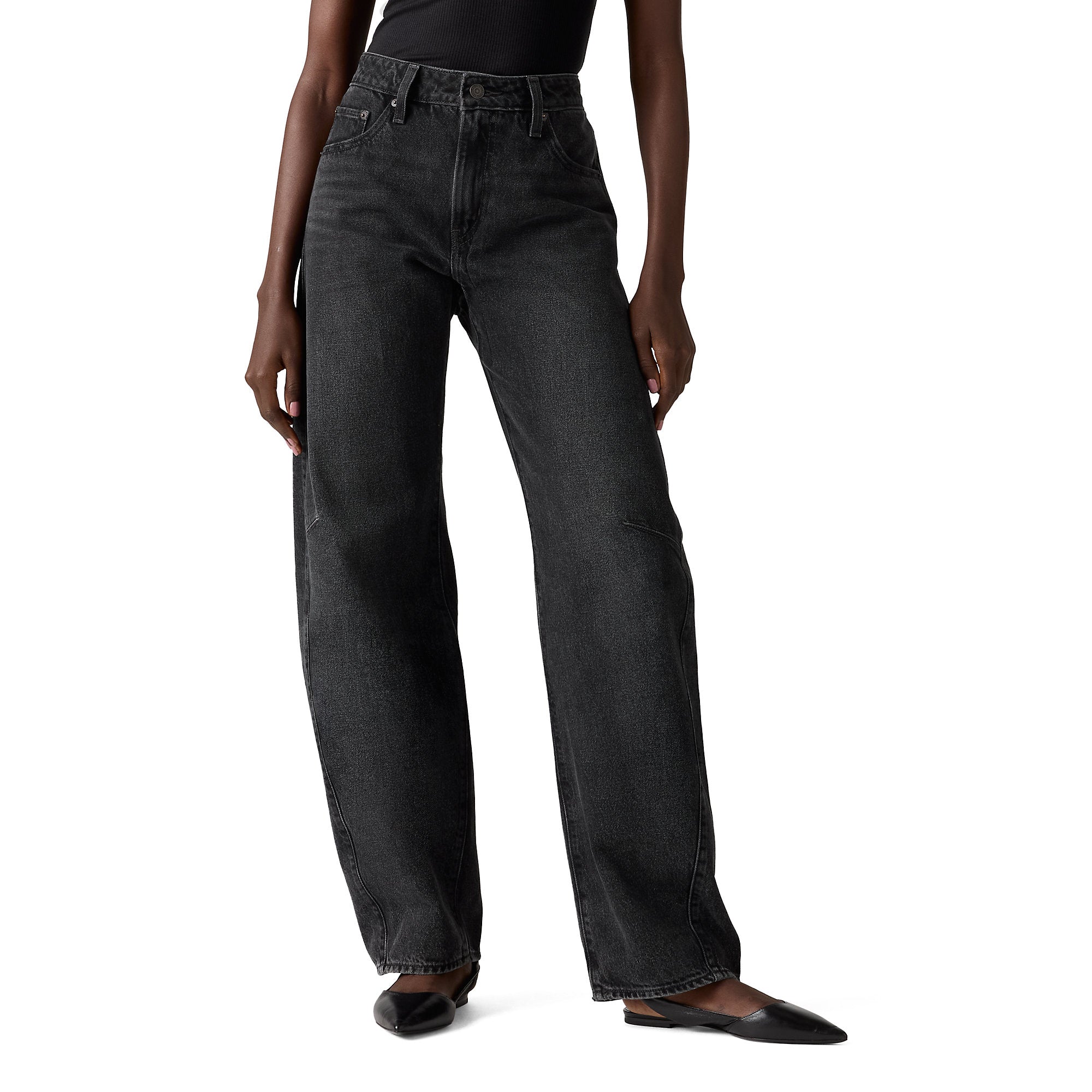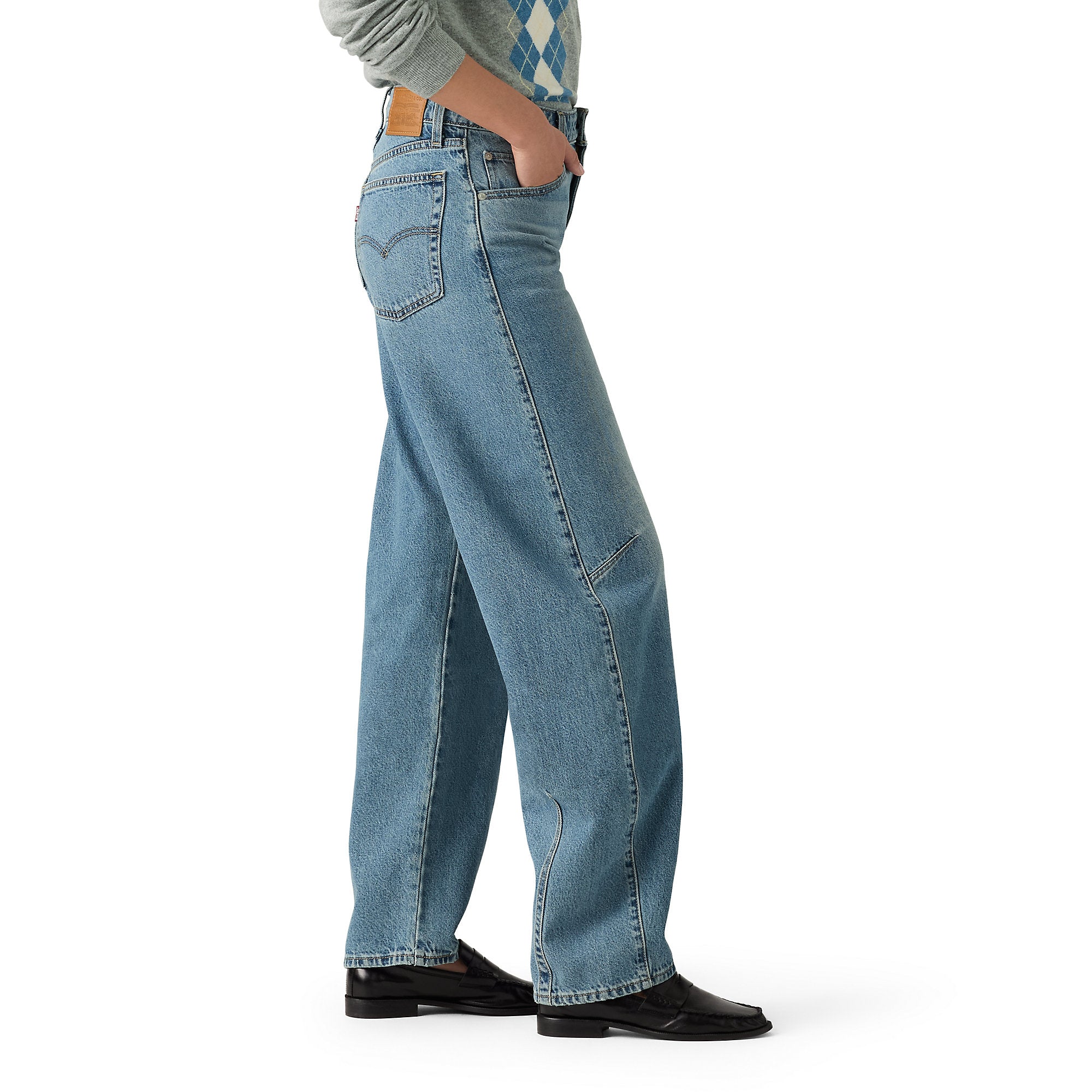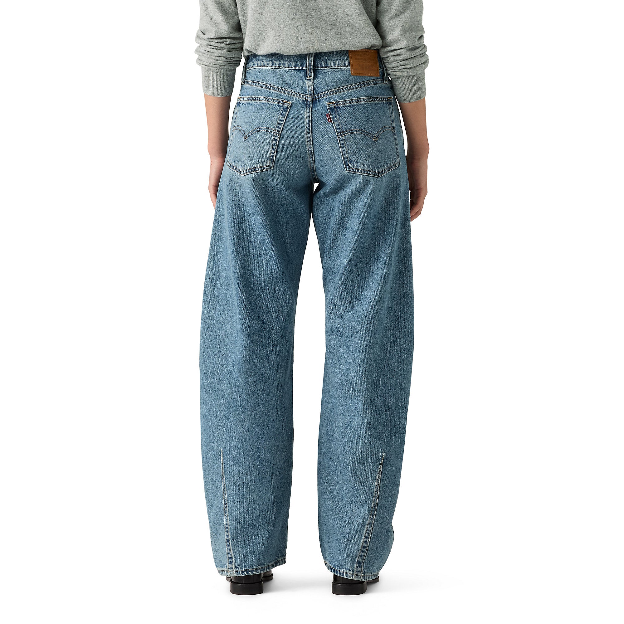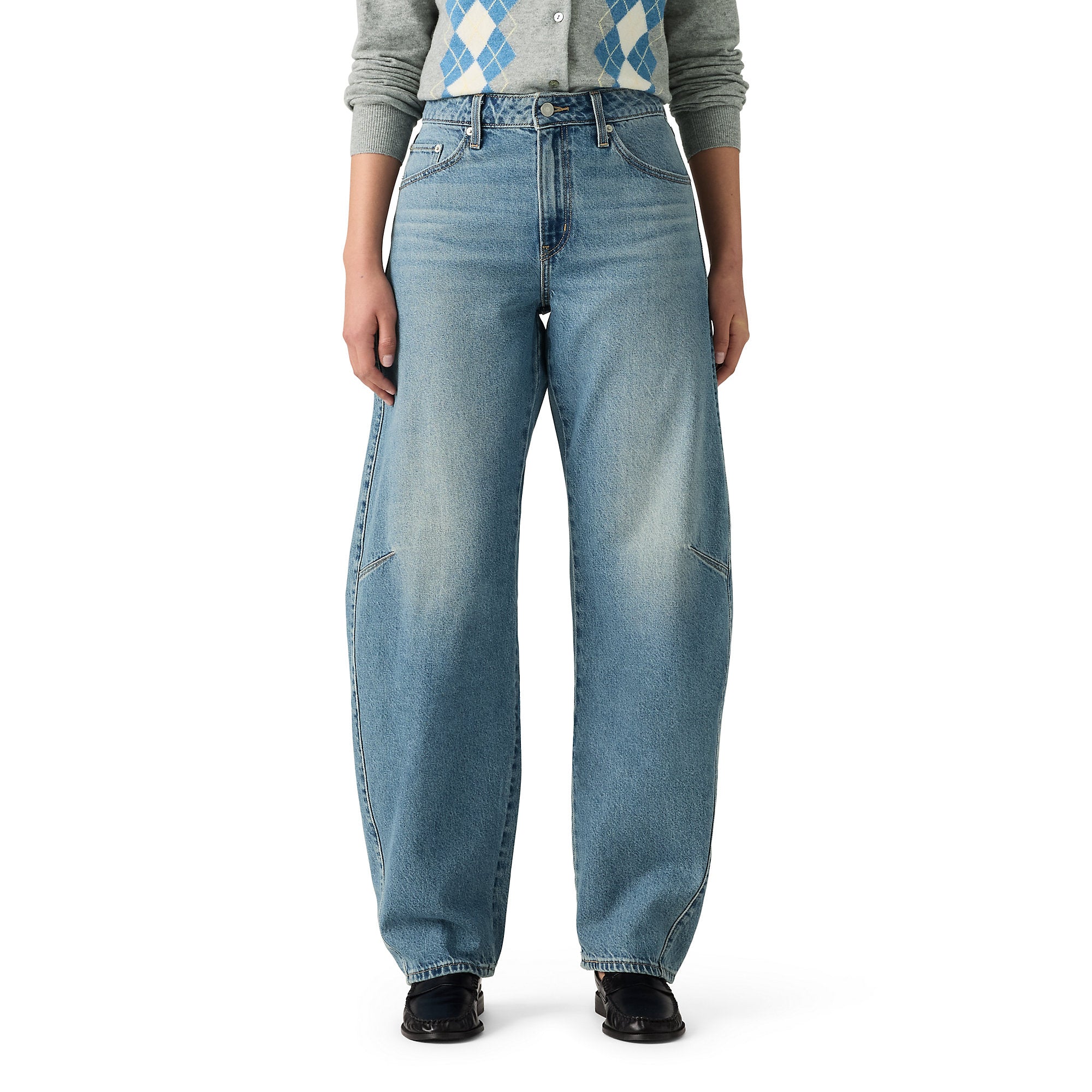 Mid rise. loose fit. tapered barrel leg. knee darts. Zip fly. Medium wash non-stretch denim.