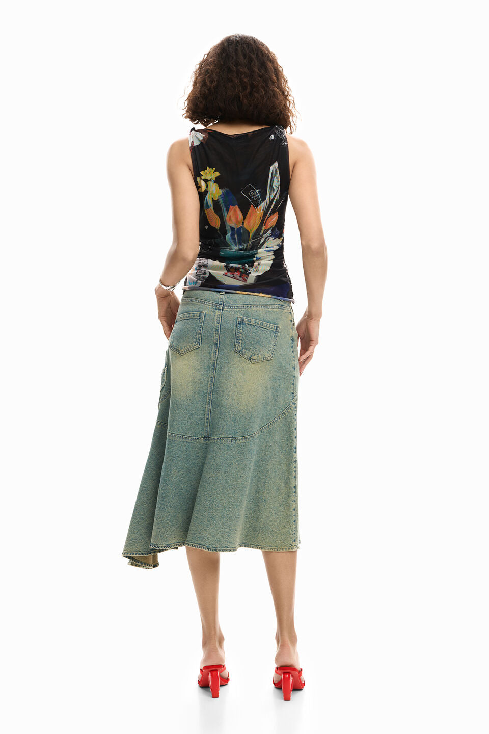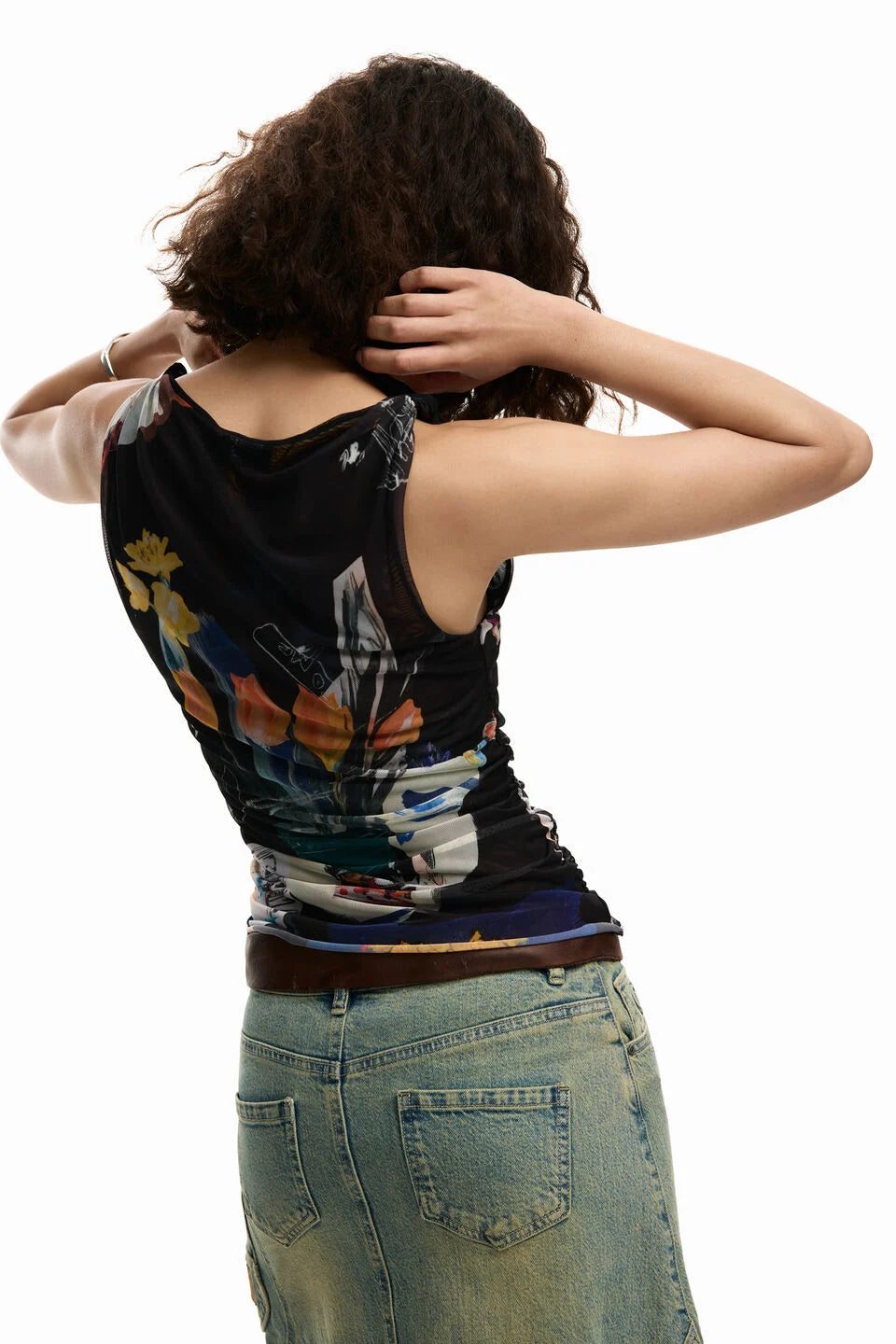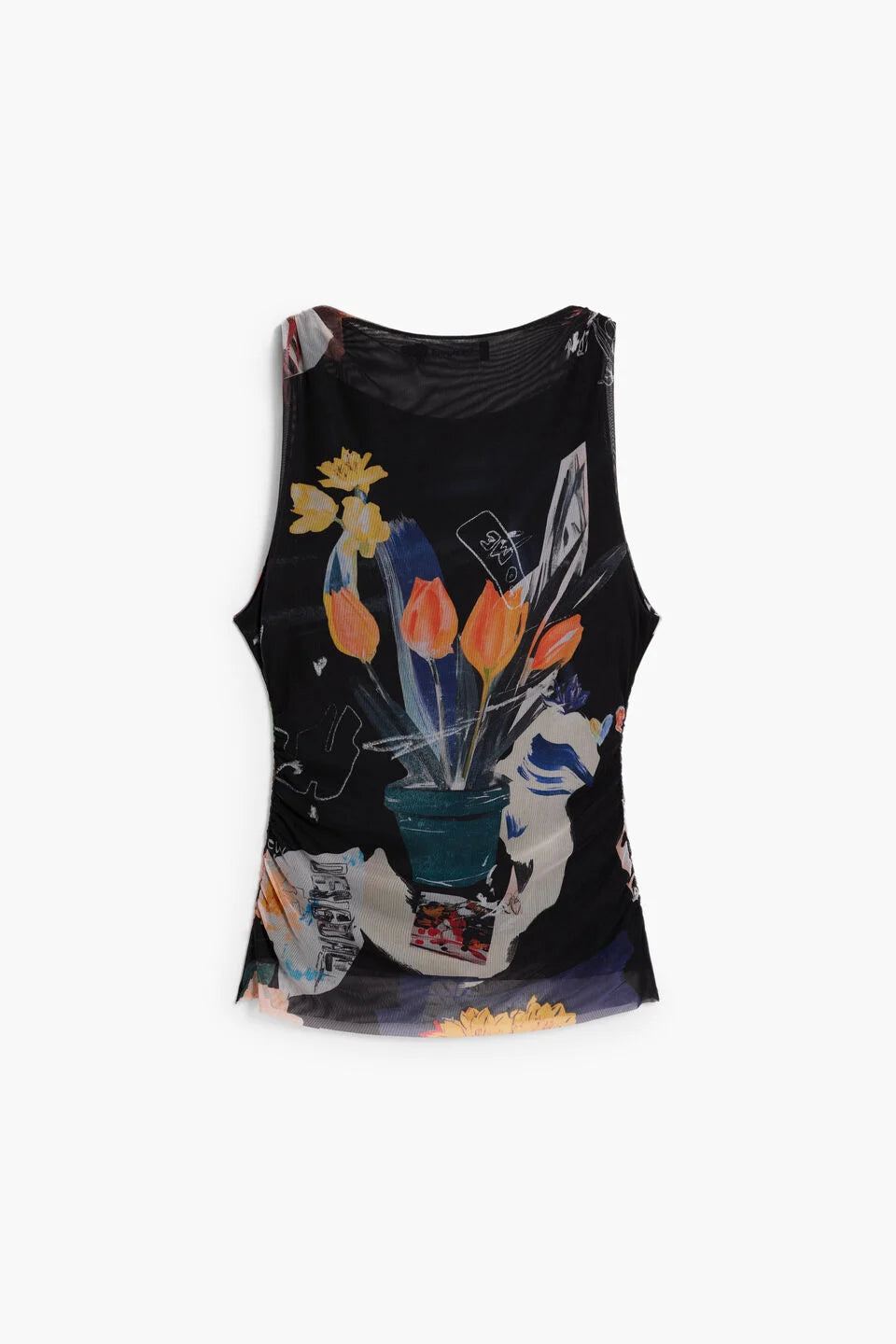 A lightweight sleeveless top crafted from sheer tulle with a soft inner lining for comfortable wear. Designed in a regular fit with a flattering boat neckline. it features a vibrant collage-style floral print that brings an artistic. contemporary edge. Perfect for layering or wearing on its own. it adds a bold yet effortless statement to everyday looks.