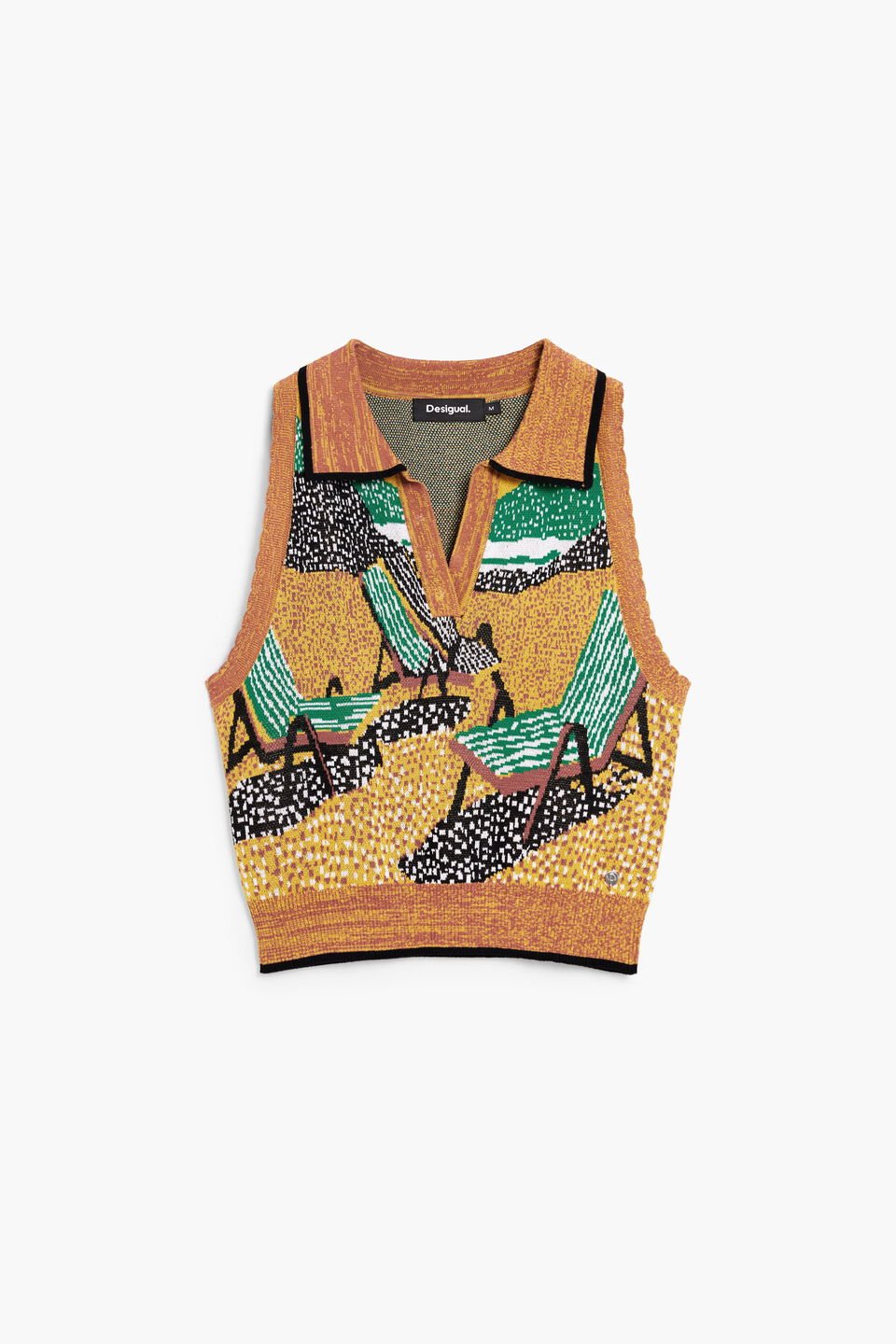 A statement knit top that brings texture and artistry together through a richly detailed jacquard construction. The graphic landscape motif creates a bold visual rhythm. while the sleeveless cut and straight silhouette keep the look clean and modern. A polo-style collar with contrasting trim adds a sporty edge. balancing the intricate pattern with a structured finish. Designed to stand out on its own or as part of a coordinated set. it offers a distinctive yet wearable approach to everyday dressing.