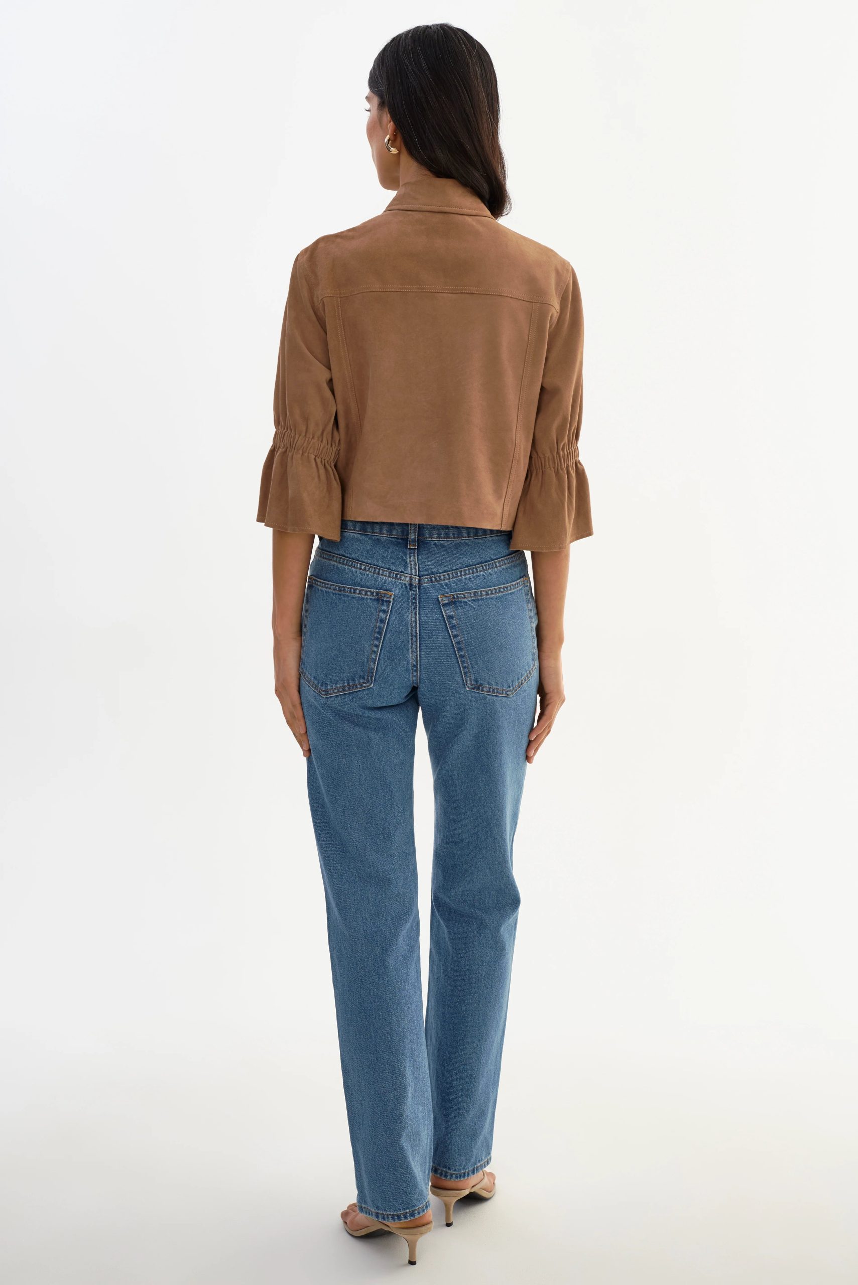 The CAROLINA Suede Ruffle Sleeve Jacket offers a softer take on the signature cropped shirt jacket. Designed with ruffled cropped sleeves and a relaxed fit. it brings an easy. feminine feel to everyday styling. Crafted in supple suede. it adds texture and warmth while keeping the silhouette light and wearable. Style it casually with denim or elevate it with tailored pieces for a more refined look.