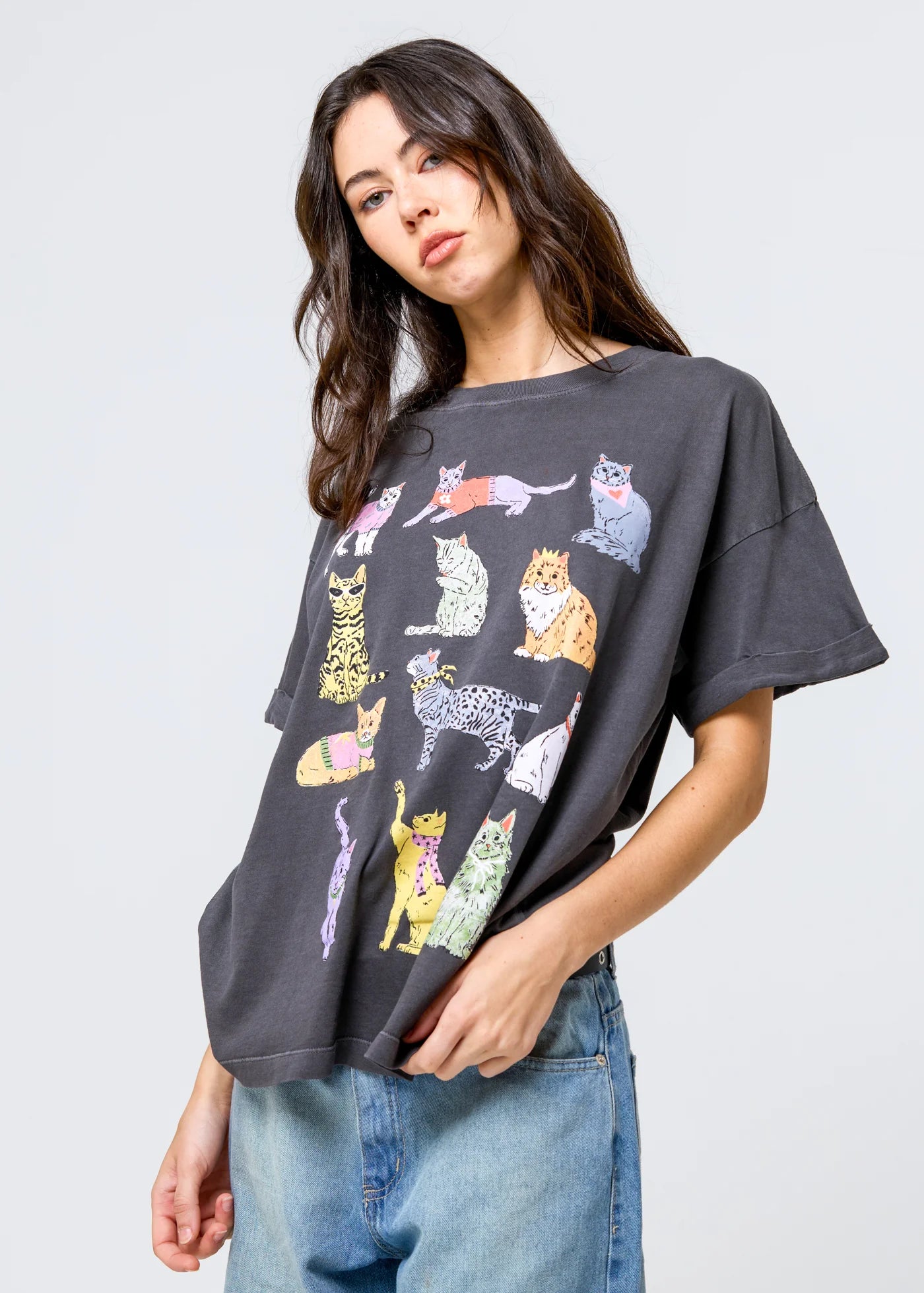 A relaxed-fit graphic tee featuring playful. colorful illustrated cats. giving it a fun yet effortlessly cool vibe. Style it with light-wash jeans and sneakers for a laid-back look. or tuck it into a skirt with boots for an easy. quirky-chic outfit.