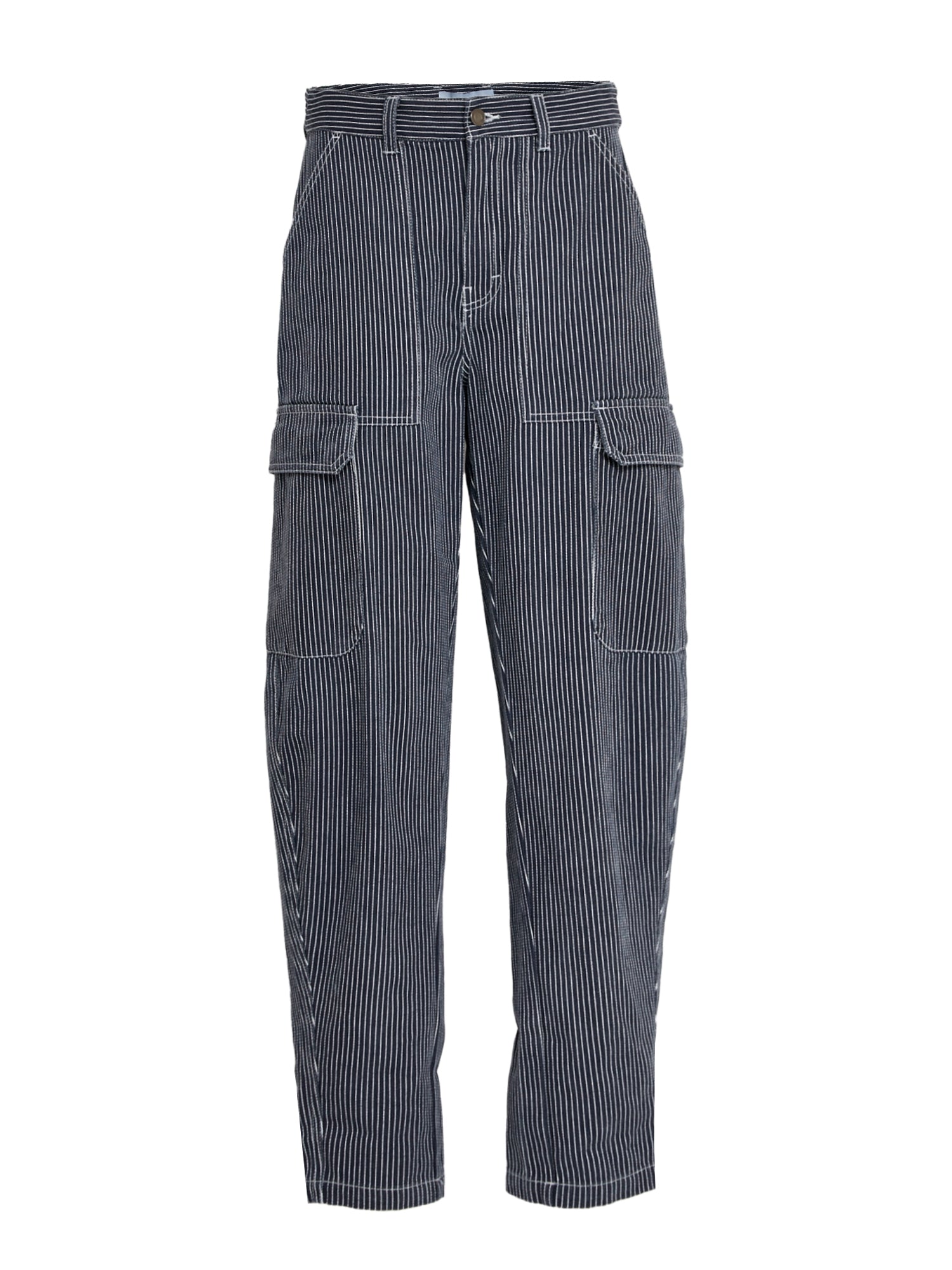 These cargo-style pants blend utility-inspired design with a refined pinstripe pattern for a contemporary look. Featuring a mid-rise waistband. straight relaxed legs. and flap cargo pockets at the sides. they offer both function and effortless style. Pair them with the matching jacket or a simple knit for a modern. laid-back outfit.