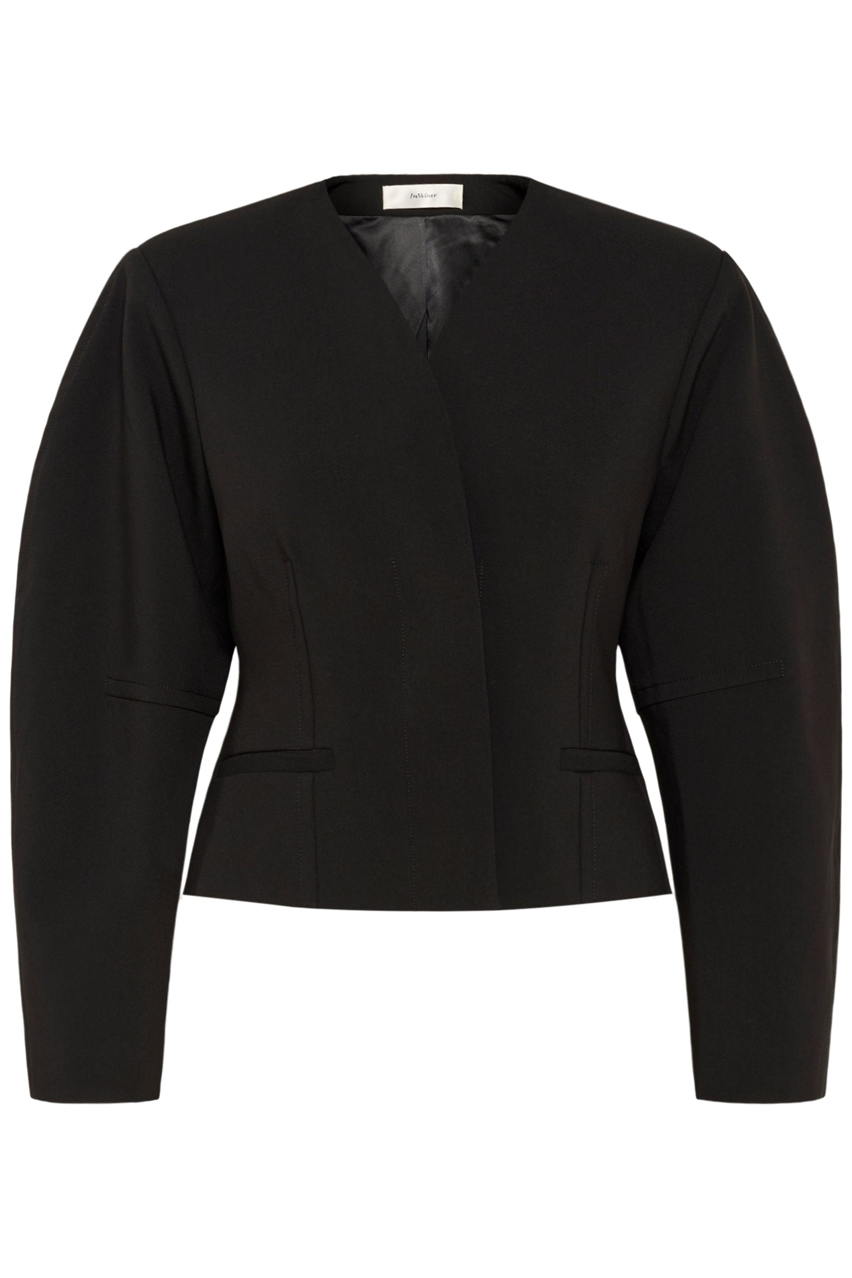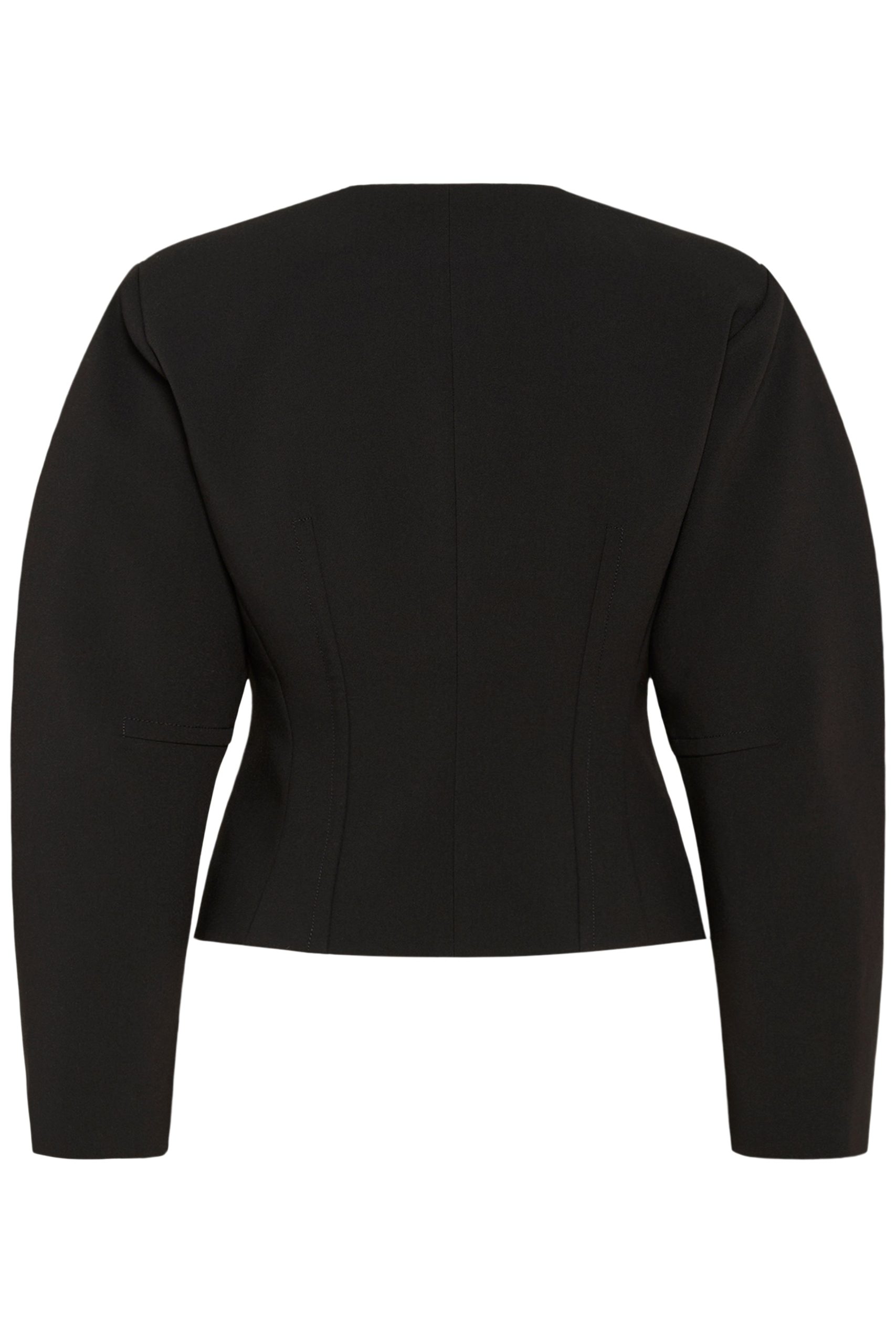 This elegant jacket features a flattering V-neckline and a tailored. cropped fit that defines the waist. The distinctive long sleeves have a subtle structured detail. adding a contemporary touch. With its clean. sophisticated design and subtle horizontal pocket accents. it’s perfect for both professional and evening wear. Pair it with high-waisted trousers or a pencil skirt for a polished ensemble. or layer it over a dress for a chic finish.