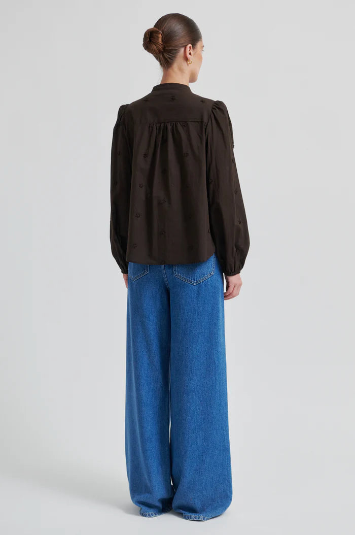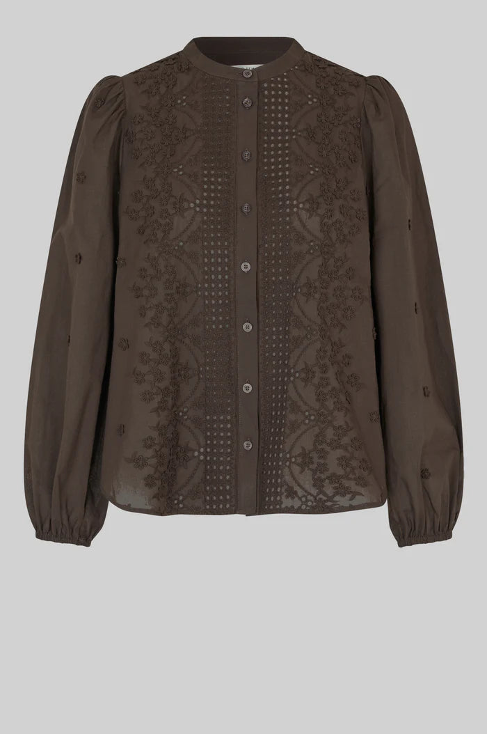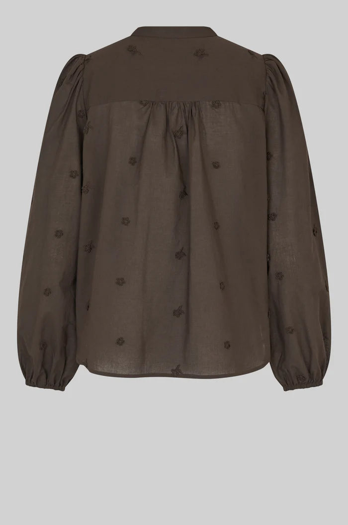 Second Female shirt with 3D details. The shirt is made in smooth cotton with all-over 3D embroidery. Featuring a round collar and button-through fastening. Gathers at shoulders and elasticated cuffs that create puffed sleeves. Regular fit.