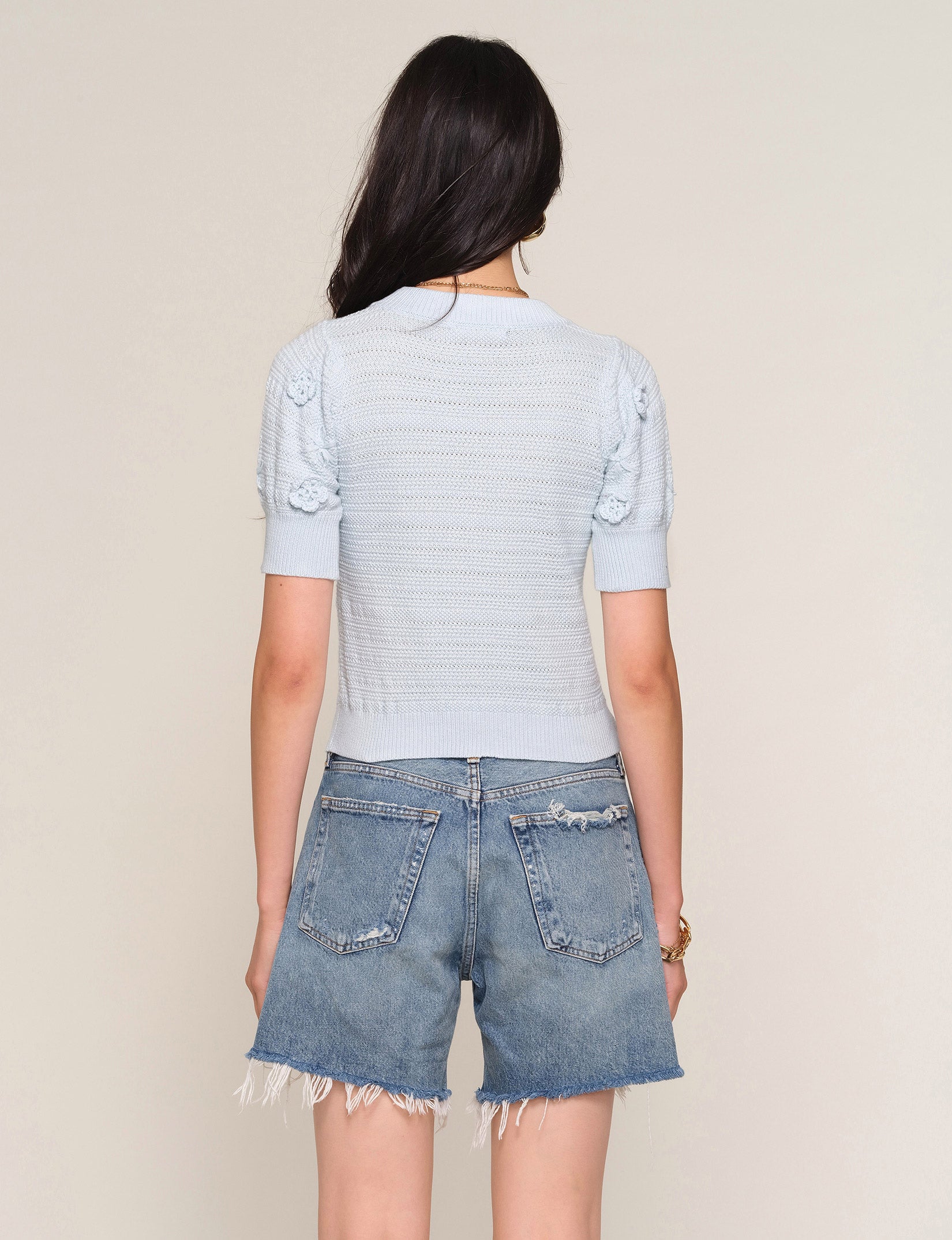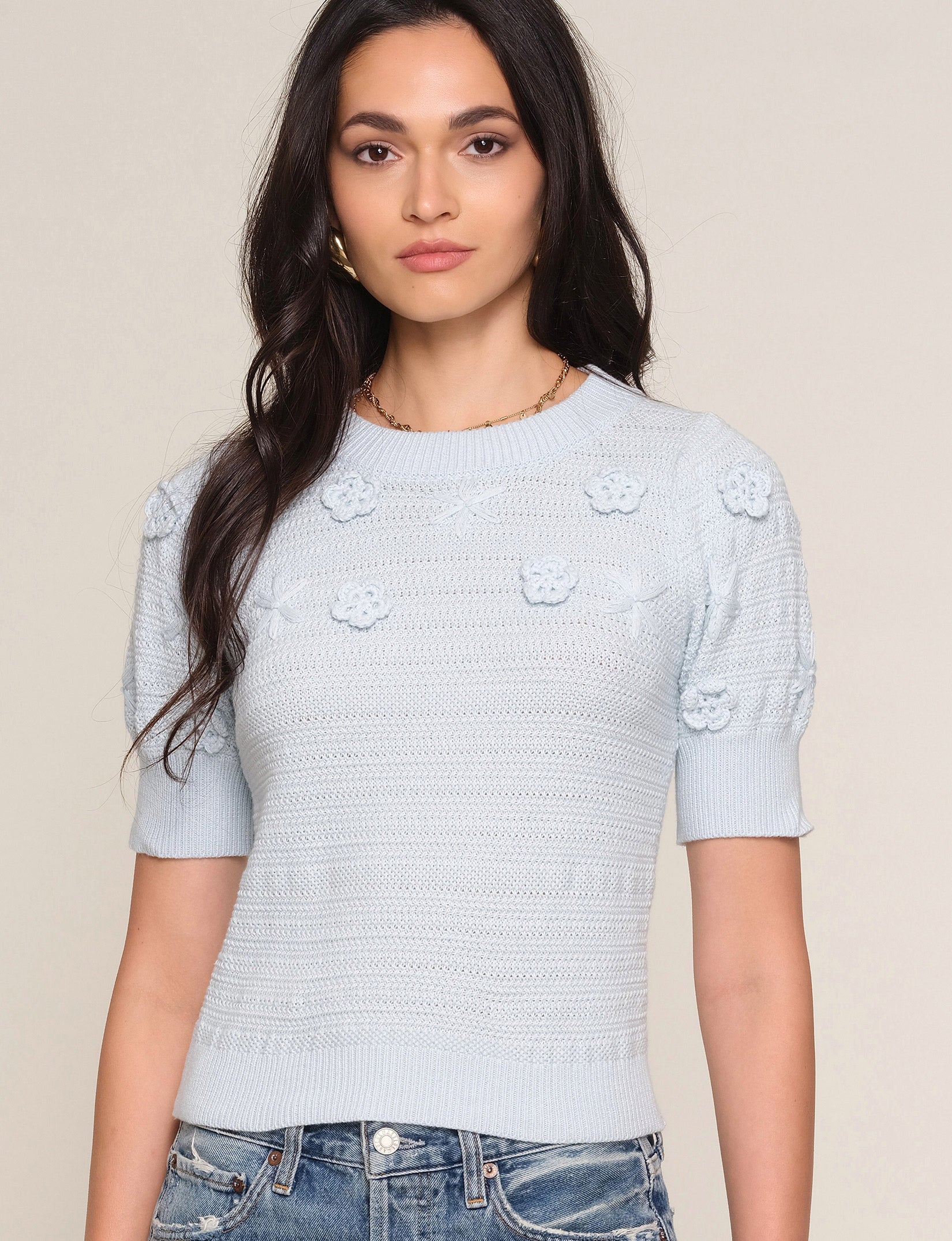 This charming knit top blends feminine detail with everyday ease. Designed with a fitted silhouette and softly structured short sleeves. it features delicate floral appliqué accents that add subtle dimension and texture. The classic crew neckline keeps the look polished. while the cropped length pairs perfectly with high-rise denim or tailored shorts. Ideal for brunch dates. casual Fridays. or weekend outings with effortless style.