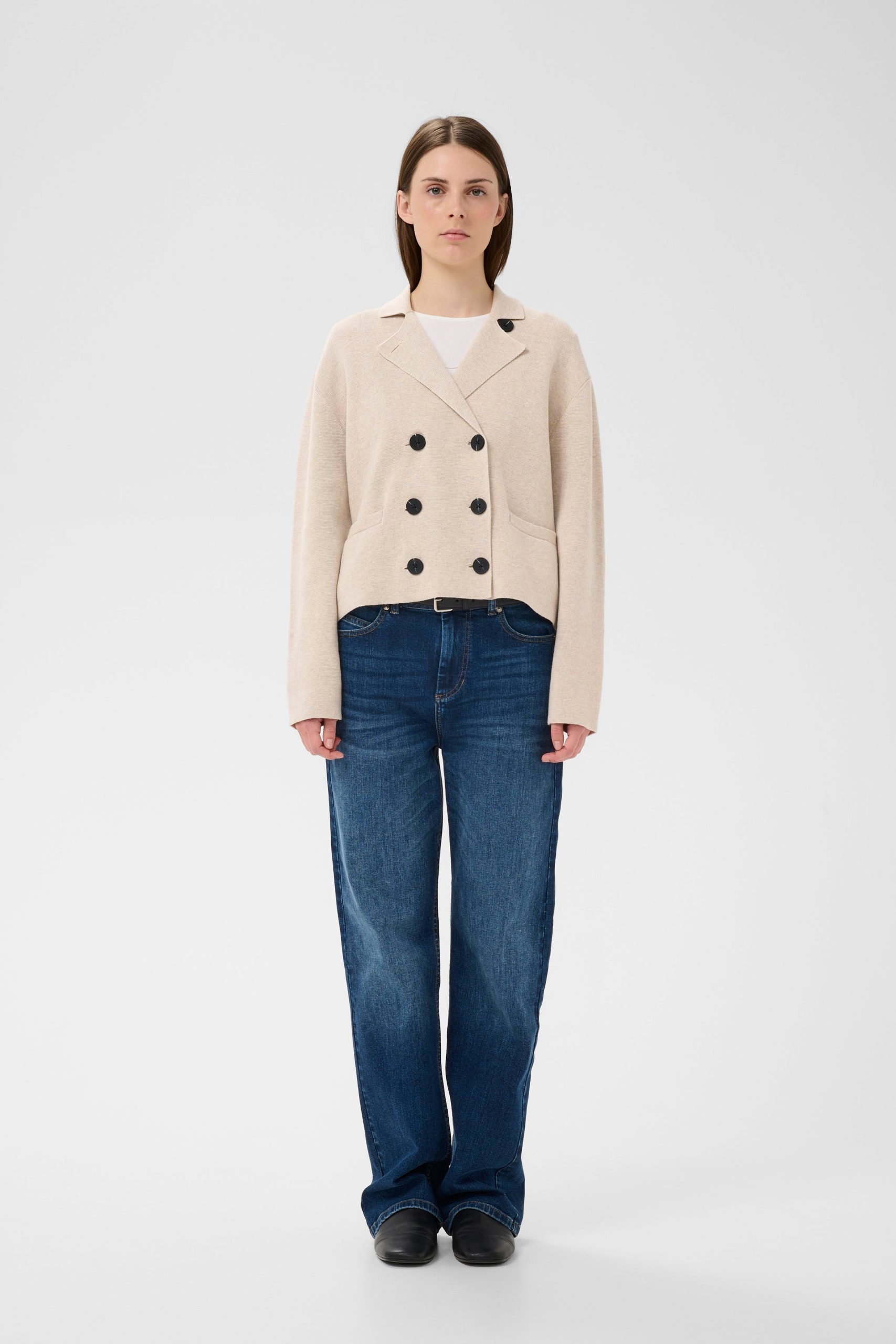 This sophisticated knit cardigan features a relaxed yet polished double-breasted design with classic lapels and a functional button closure. Its slightly cropped length and two front pockets offer a contemporary touch. perfect for transitional seasons. Ideal for layering. this versatile piece can elevate a casual jeans-and-tee look or add a smart finish over a dress or tailored separates for a refined ensemble.