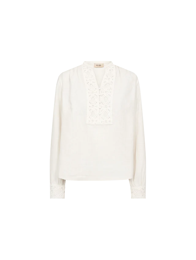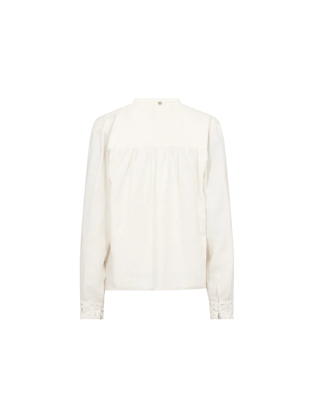 A beautifully detailed blouse crafted from a soft linen-cotton blend. Designed in a relaxed silhouette with delicate broderie anglaise along the neckline and cuffs. adding a touch of elegance to the natural texture. Pair it with tailored pants or denim for a refined yet effortless look.