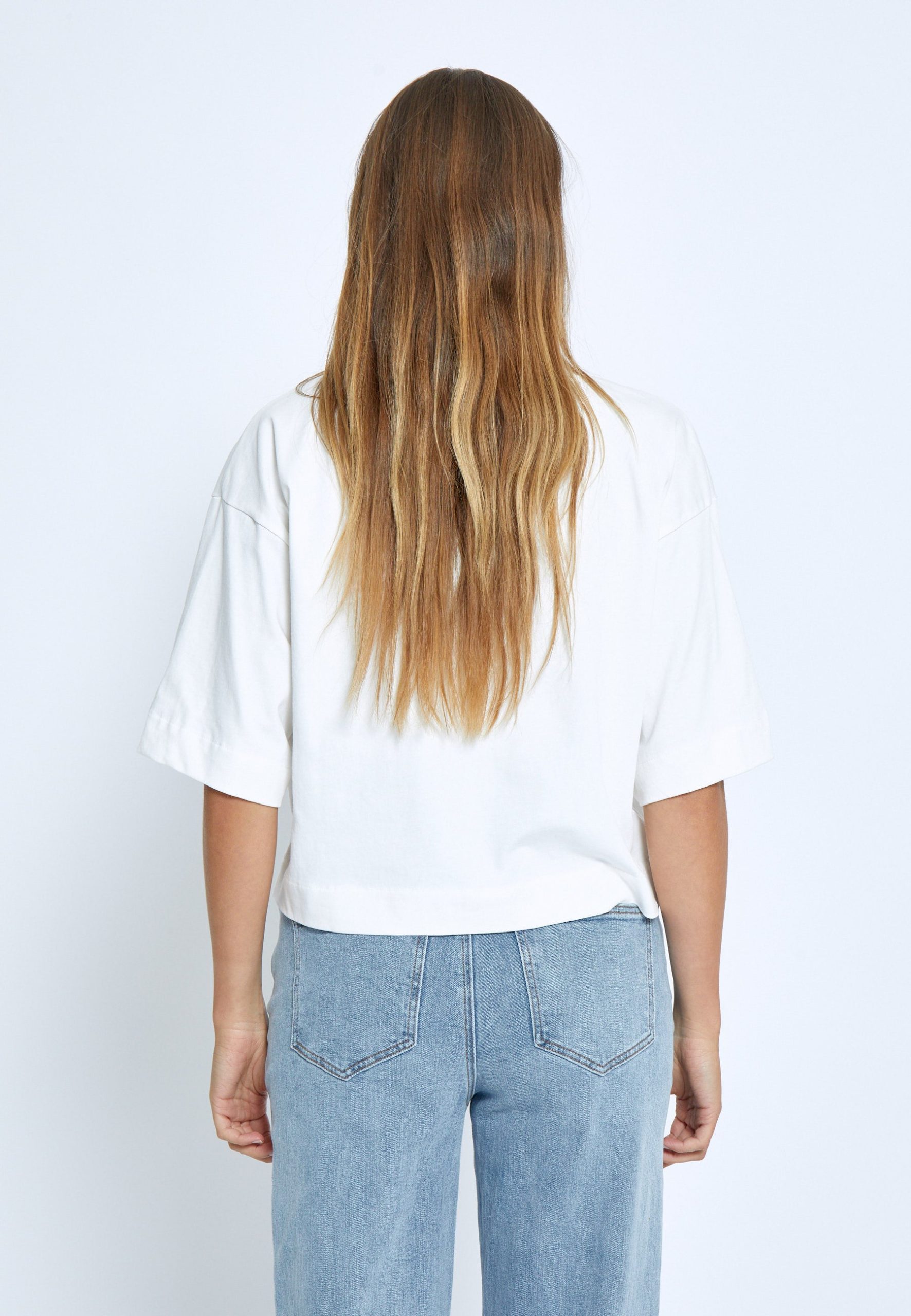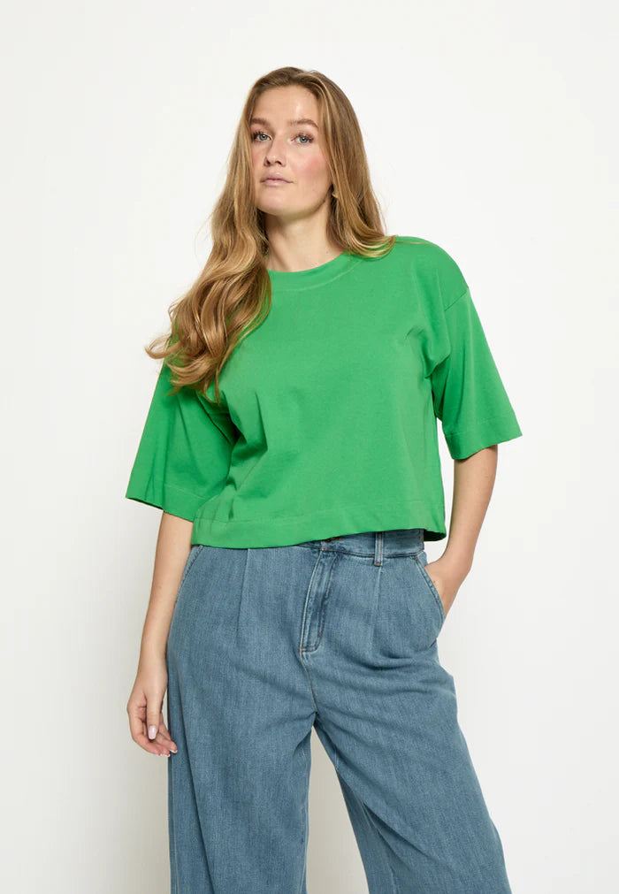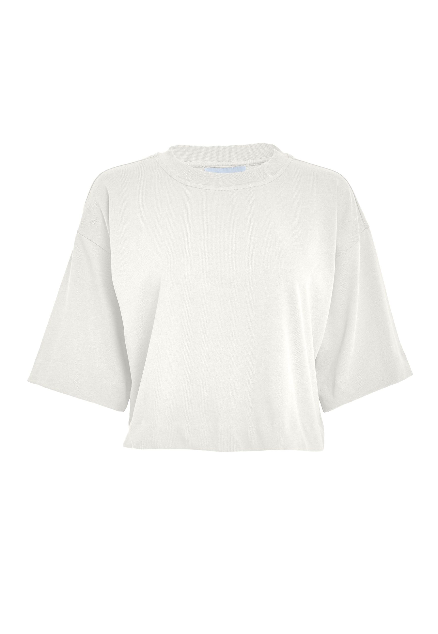 This cropped tee features a straight. boxy silhouette with dropped shoulders. wide short sleeves. and a classic crew neckline for a laid-back look.