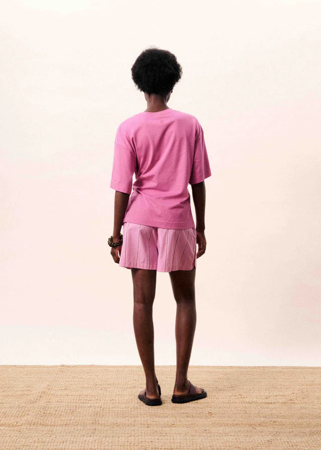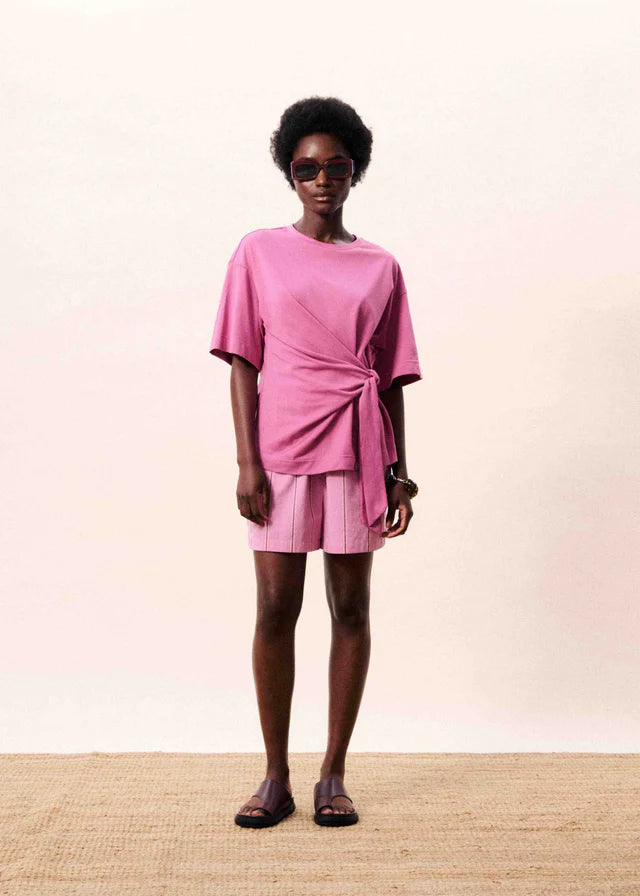 This cotton jersey T-shirt features a classic crew neckline and a straight. easy fit that makes it perfect for everyday styling. The decorative side bow adds a subtle feminine touch—pair it with high-waisted denim or tailored trousers to highlight the detail. For a relaxed look. wear it with linen shorts and sandals. or dress it up with a midi skirt and minimal jewelry.