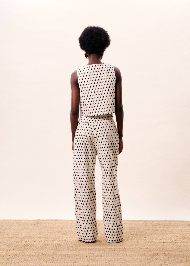 These high-rise trousers feature a subtle all-over graphic motif that adds texture and visual interest. Designed with a flattering fitted waist and flowing wide-leg silhouette. they create an elongated. effortless shape. Softly structured yet comfortable. they pair beautifully with the matching cropped top or a simple blouse for a balanced. modern look.