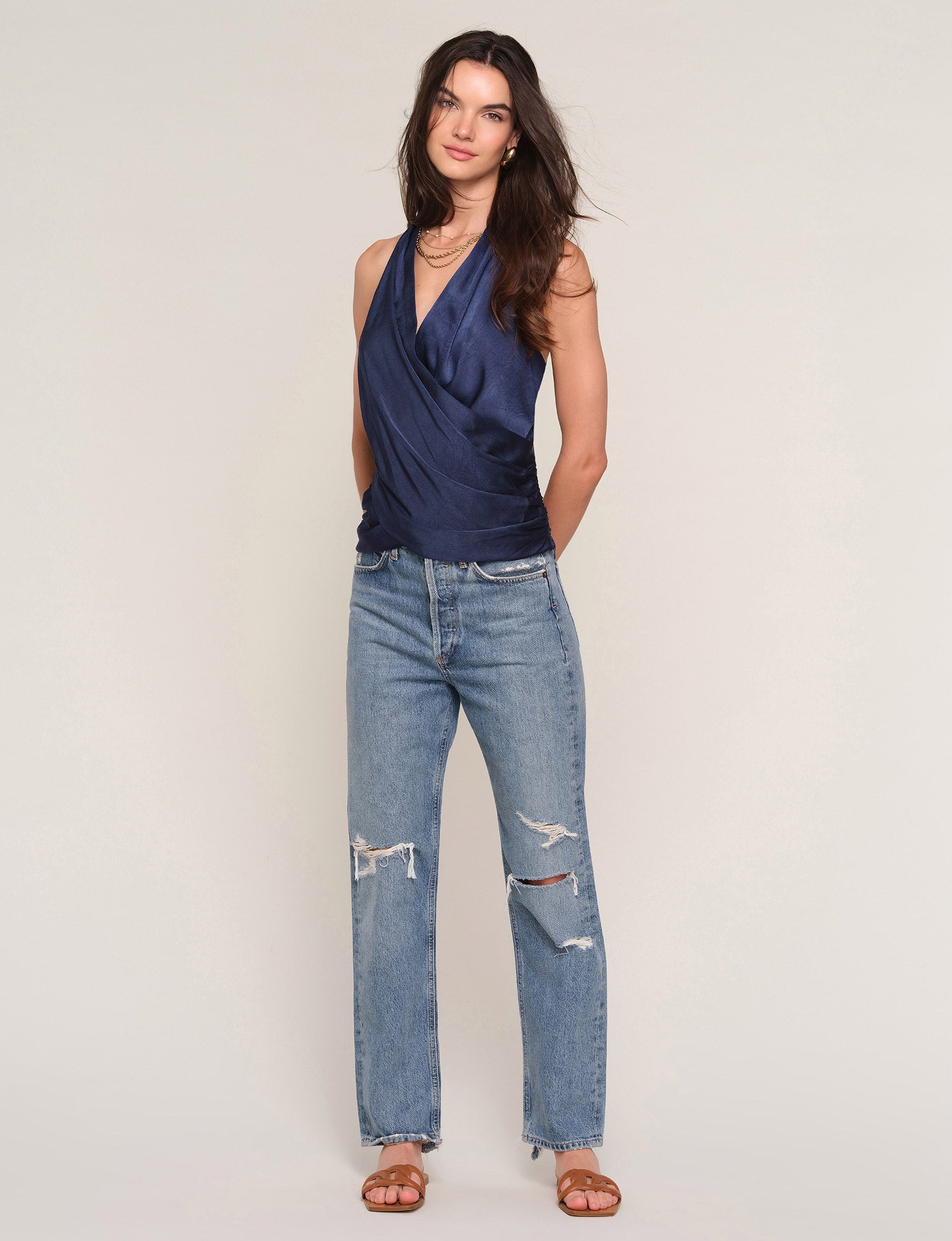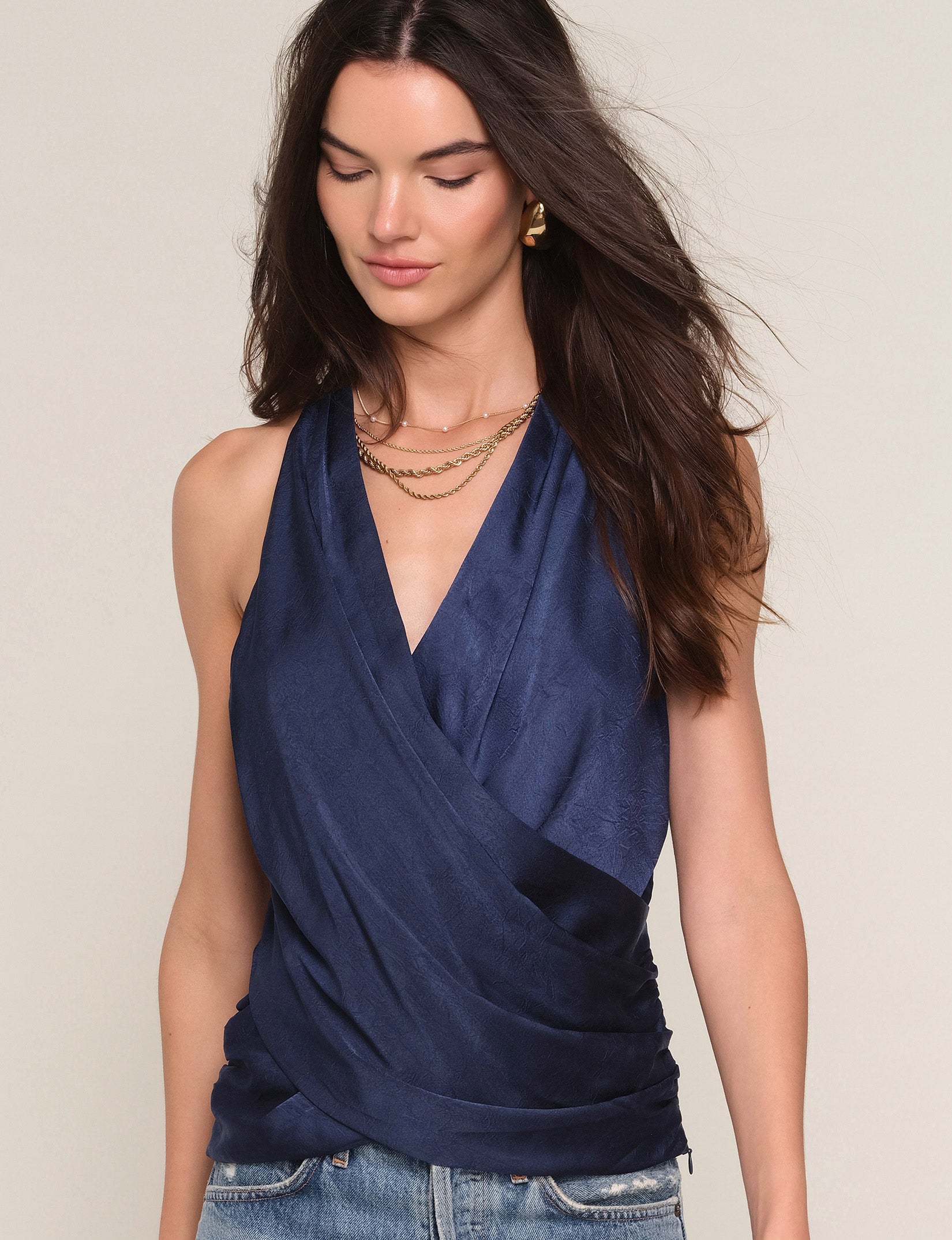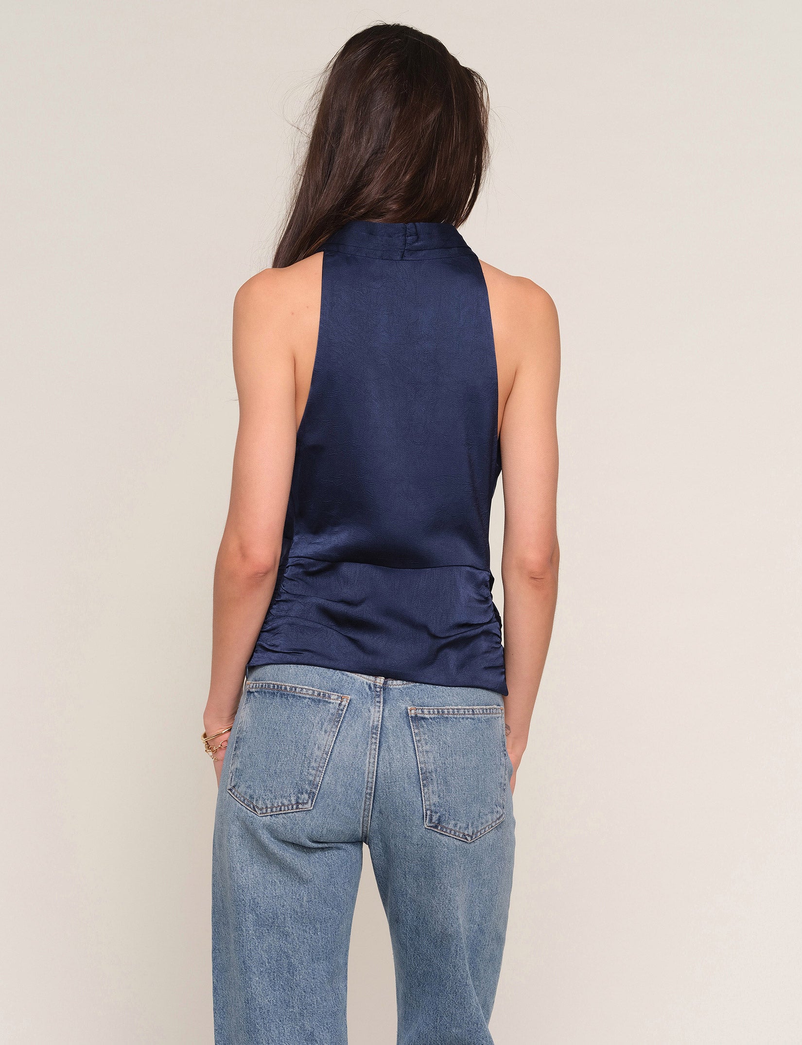 This sleeveless top features a romantic. draped silhouette with a deep wrap-style V-neckline that creates elegant folds across the bodice. The design is accented by gathered detailing along the side seams. adding subtle texture and a flattering. tapered fit at the waist. A high. structured collar at the back transitions into the plunging front for a sophisticated look.