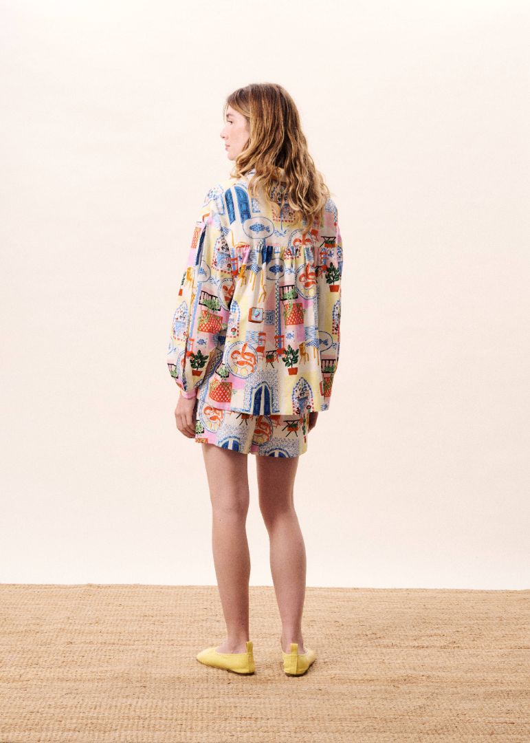 These relaxed shorts showcase a vibrant illustrated motif inspired by travel scenes and decorative details. Designed with a comfortable high-rise fit and softly flared leg. they offer effortless movement and an airy feel. The lightweight silhouette makes them perfect for warm days—style them with the matching shirt for a coordinated look or pair with a simple top for casual charm.