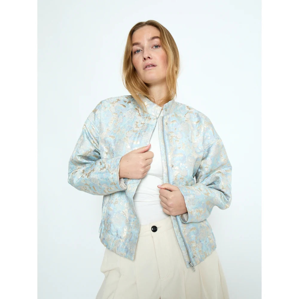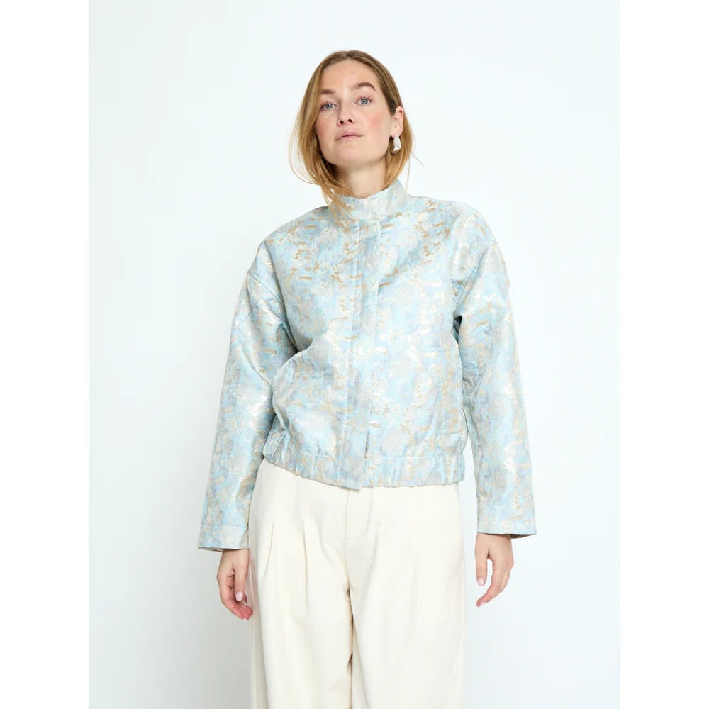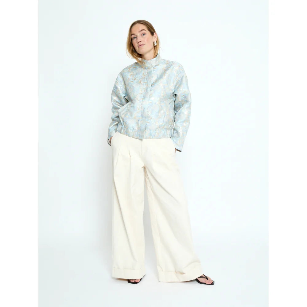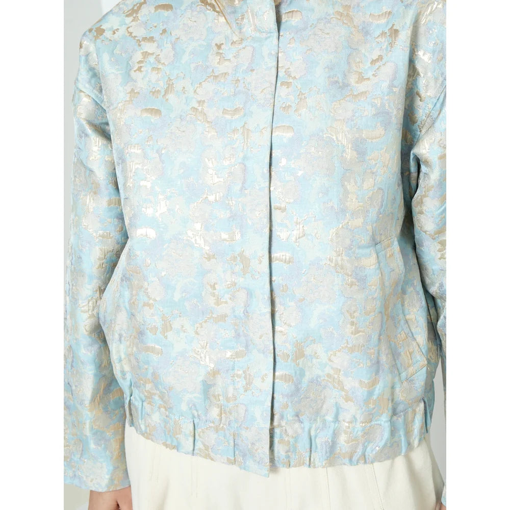 This cropped jacket stands out with its richly textured jacquard fabric and softly luminous finish. Designed with a structured stand collar and concealed front closure. it features relaxed sleeves and a gently gathered hem for a modern silhouette. Perfect for layering over denim. dresses. or tailored pieces. it adds a refined yet contemporary touch to everyday styling.