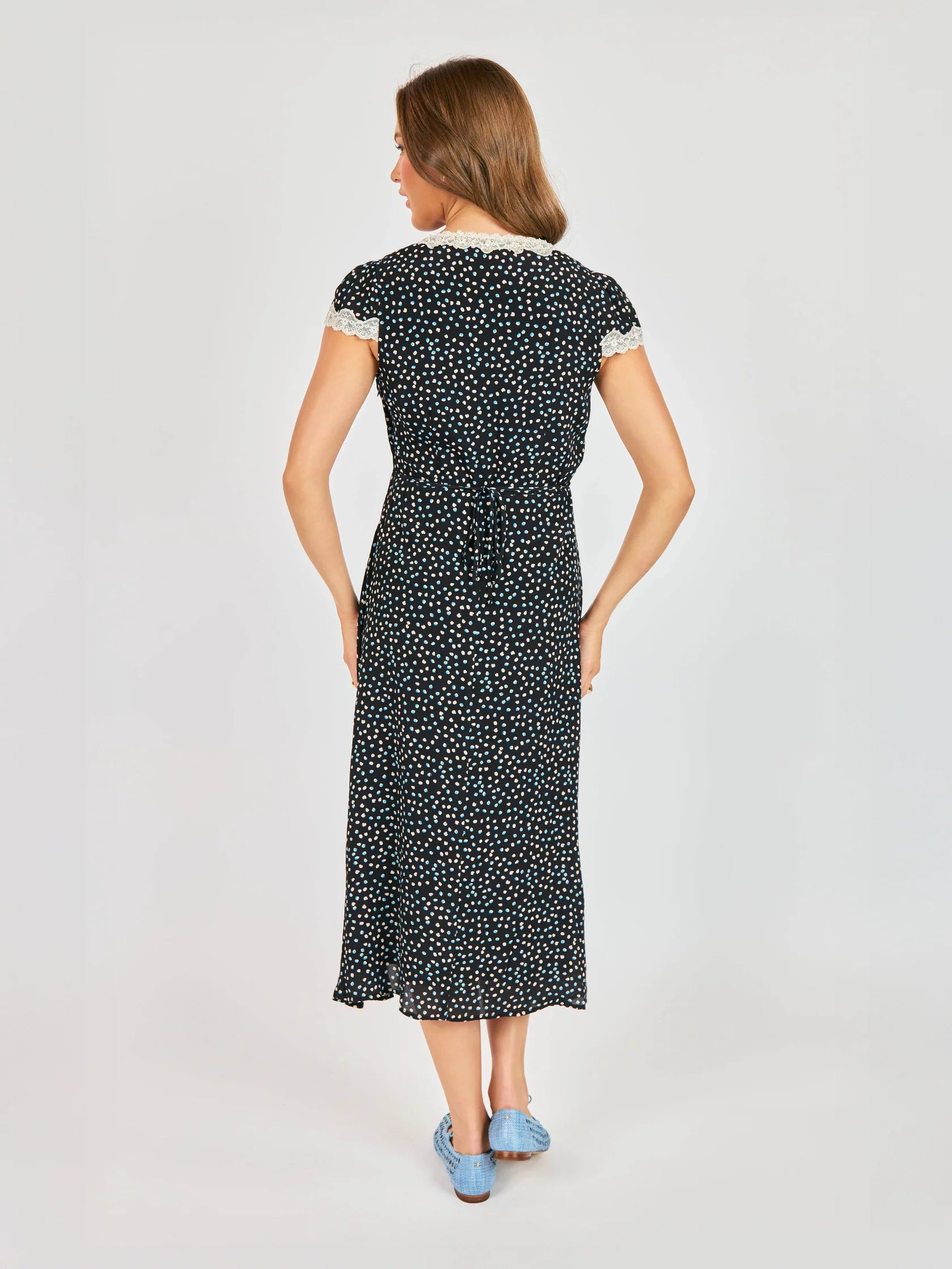 Elegance meets everyday charm in the New Romance Midi Dress.? Scalloped Lace Trim – Contrast cream lace detailing along the V-neckline and sleeves for a romantic. antique feel.? Ditsy Floral Print – A timeless multi-colored micro-floral pattern set against a deep midnight backdrop.? Empire Waistline – A high-waist seam that creates an elongated. flattering shape before flowing into a midi skirt.