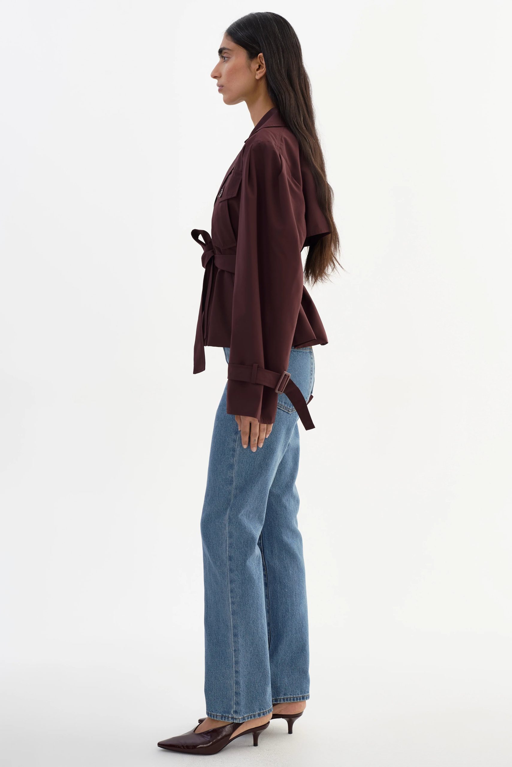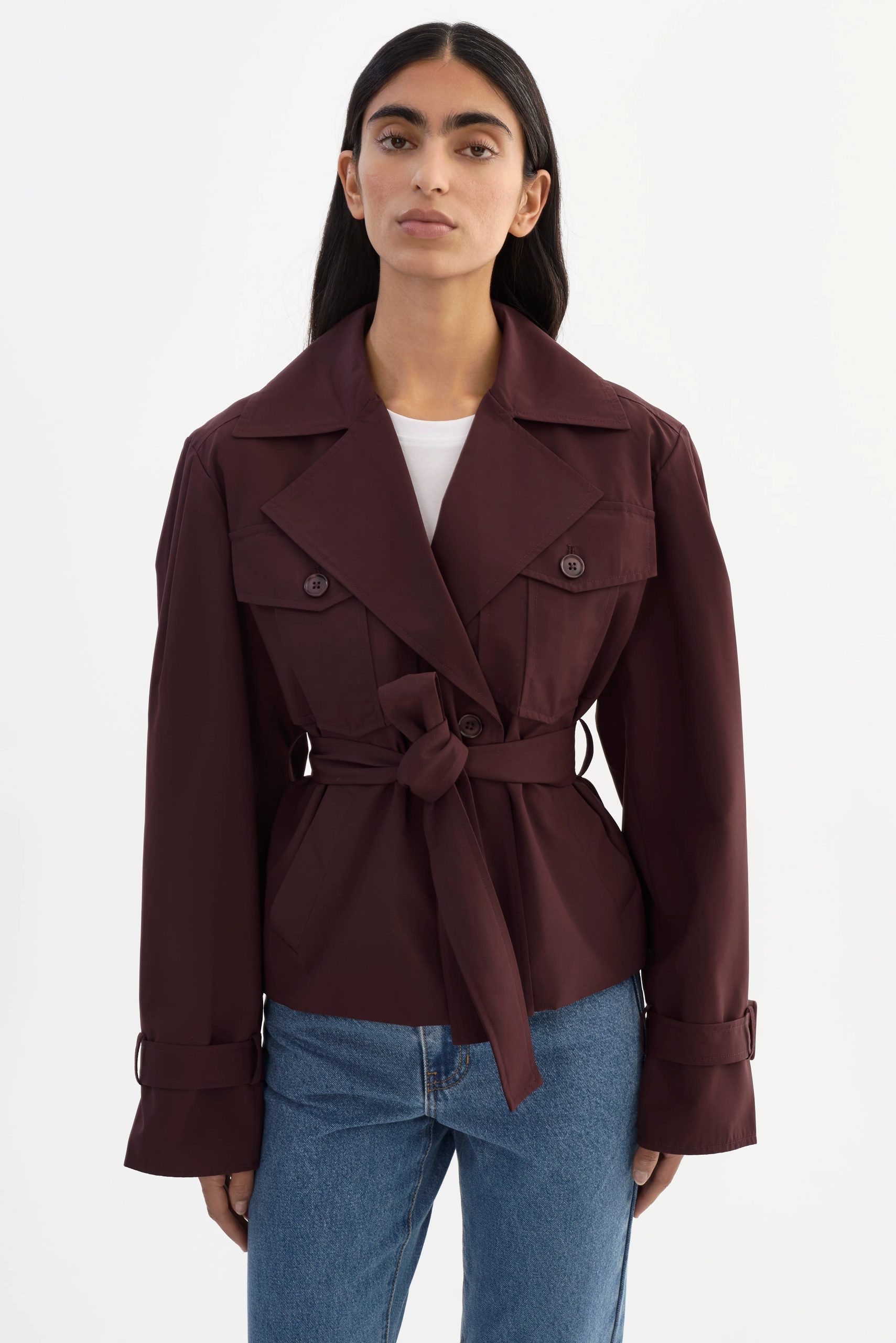 The QUINN Cropped Trench Coat reimagines a timeless silhouette with a chic. modern spin. Featuring a defined waist and voluminous sleeves. it offers a refined statement piece. Perfect for the fashion-forward woman seeking a versatile outer layer. this jacket brings polished style to every look.
