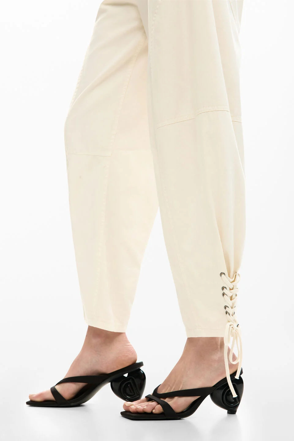 These long cotton trousers feature a modern balloon fit that tapers softly at the ankle for a sculpted yet relaxed silhouette. Front pleats add structure. while visible side pockets enhance their utilitarian feel. Finished with an adjustable drawstring at the hem. they offer a customizable shape. blending comfort and contemporary style for effortless everyday wear.