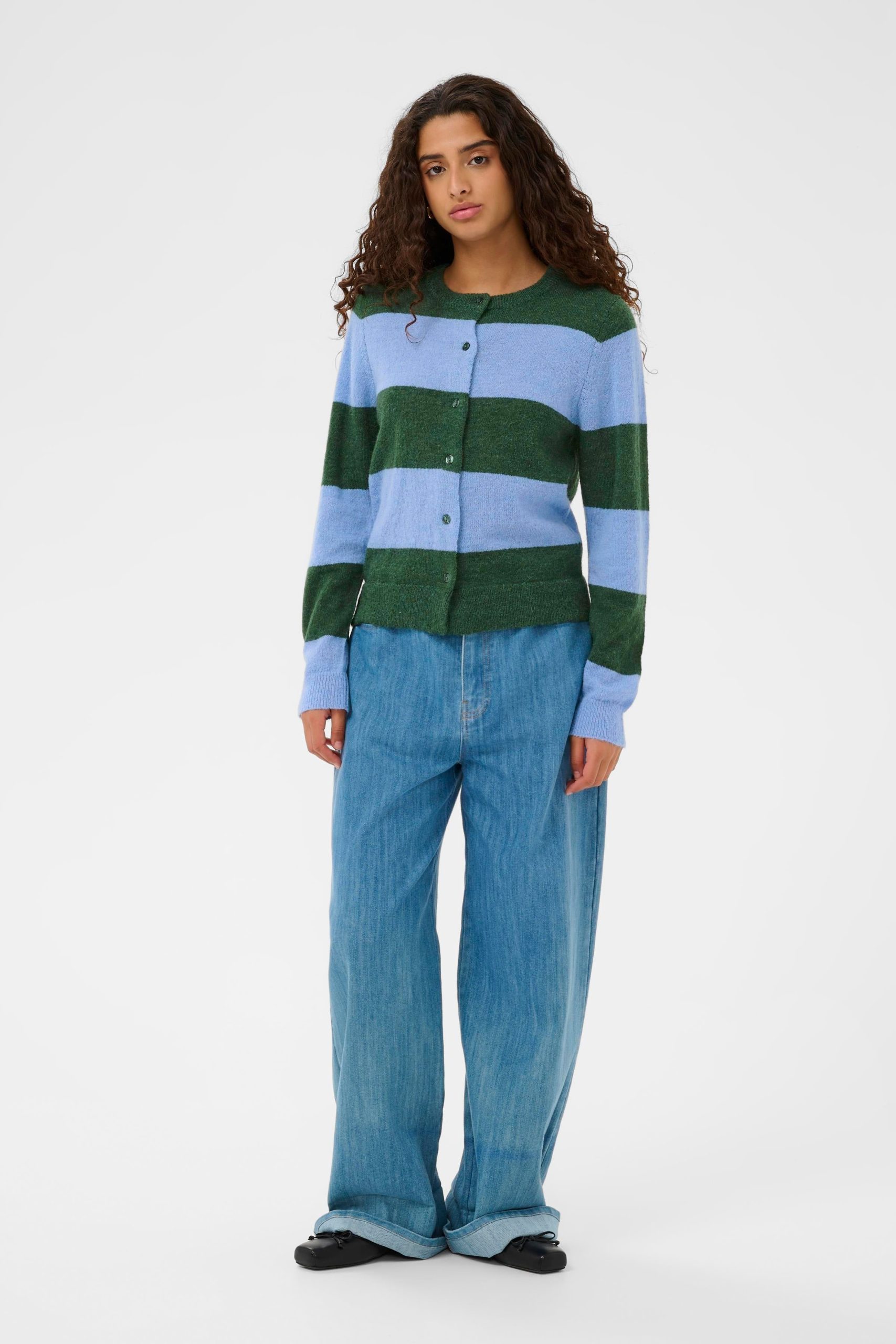 This striped cardigan offers a fresh take on everyday layering with its classic round neckline and button-down front. Designed in a softly structured knit with ribbed trims and a flattering regular fit. it brings subtle texture and dimension to your look. Style it over a simple tee or wear it solo with relaxed denim for an effortlessly polished outfit perfect for transitional days.