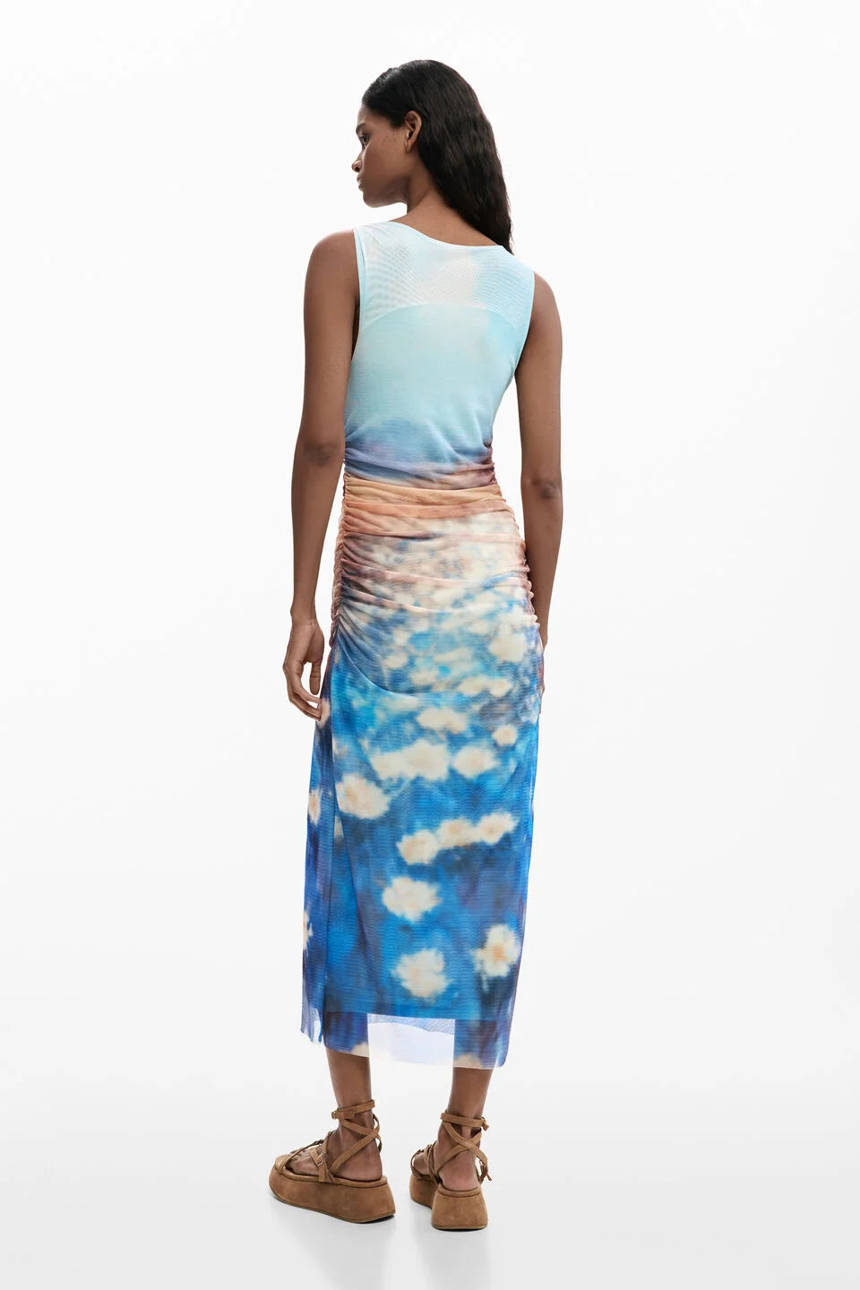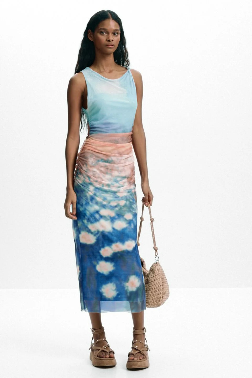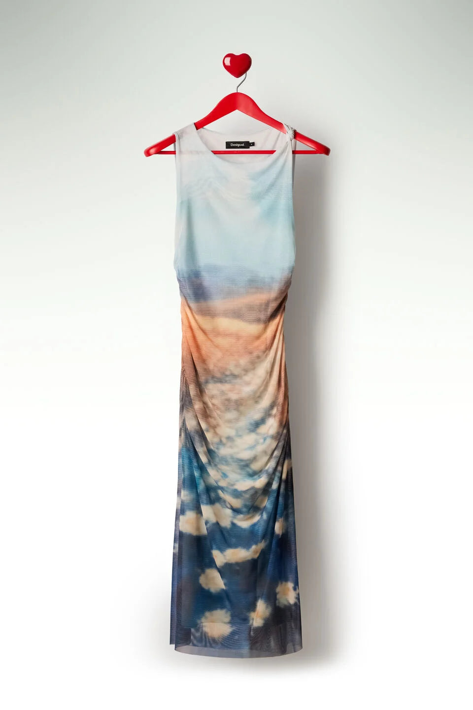 A fluid sleeveless dress crafted from delicate tulle. designed to contour the silhouette with a soft. body-skimming fit. The round neckline keeps the look clean and refined. while subtle stretch ensures comfort and ease of movement. Draping through the waist creates a flattering. sculpted effect that enhances the natural shape without feeling restrictive. The long. airy silhouette falls effortlessly. layered over a smooth inner lining for coverage while maintaining a light. sheer dimension. Finished with an artistic landscape-inspired print. this piece brings a sense of movement and visual depth. making it an elegant choice for both day and evening wear.