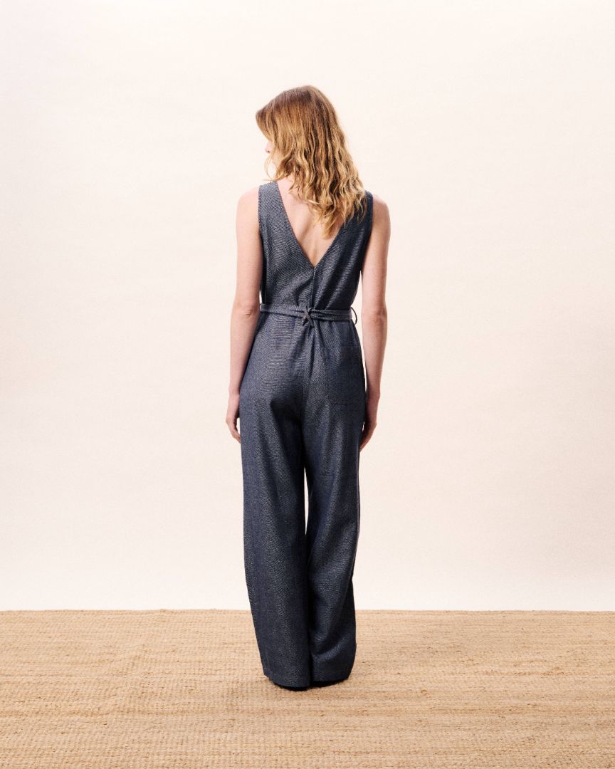This sleeveless jumpsuit features a flattering V-neckline at the front and back. accented with button detailing through the bodice. Designed with a removable self-tie belt to define the waist. it falls into relaxed wide legs for an elongated. effortless look. Functional side pockets and subtle seam details complete this versatile one-piece. perfect for polished day-to-evening styling.